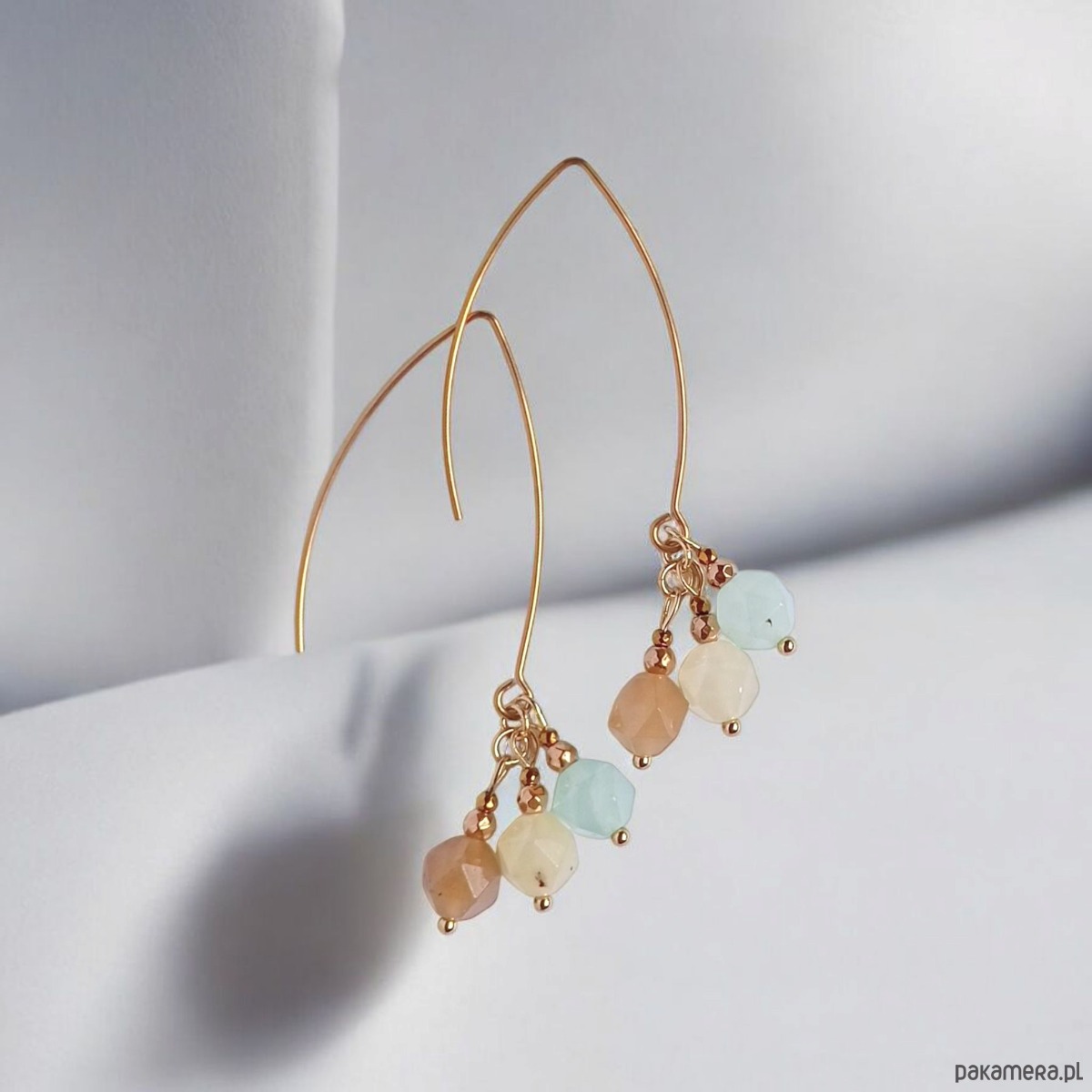 Długie, niezwykle efektowne kolczyki wykonane z wielobarwnego jadeitu amazonitowego o ciekawym szlifie (ok 8mm) ,przekładek ze złotego hematytu.