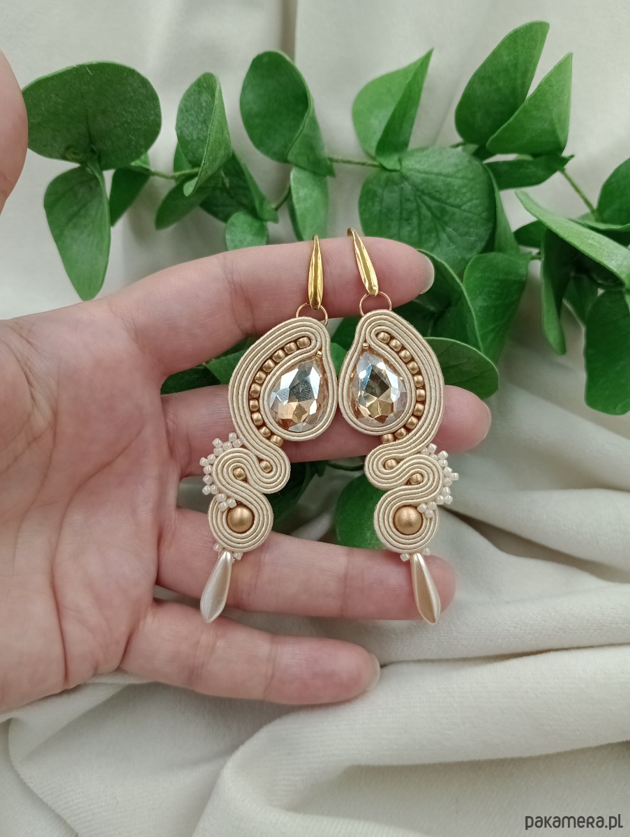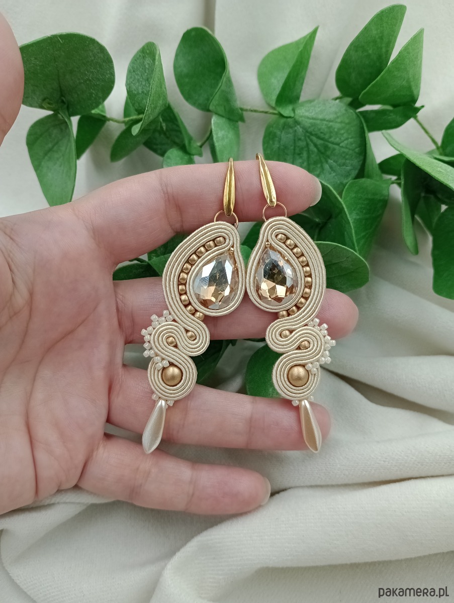 Długie kolczyki sutasz na wesele, beżowe złote kolczyki