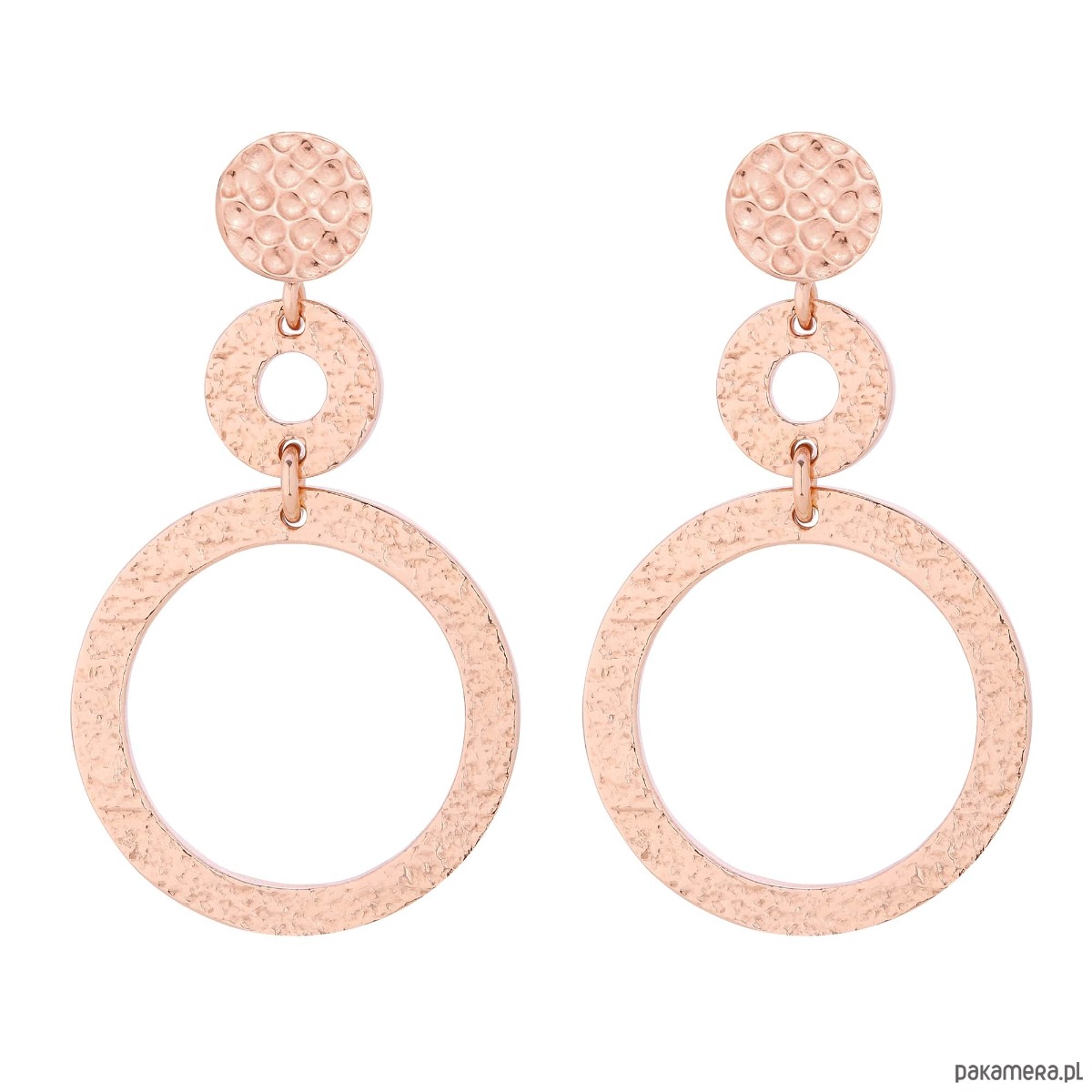 Złote długie kolczyki z chropowatymi obręczami. Zapinane na sztyft. Kolczyki posiadają zapięcia (baranki). Całość wykonana ze srebra 925 powlekanego 18 karatowym różowym złotem.