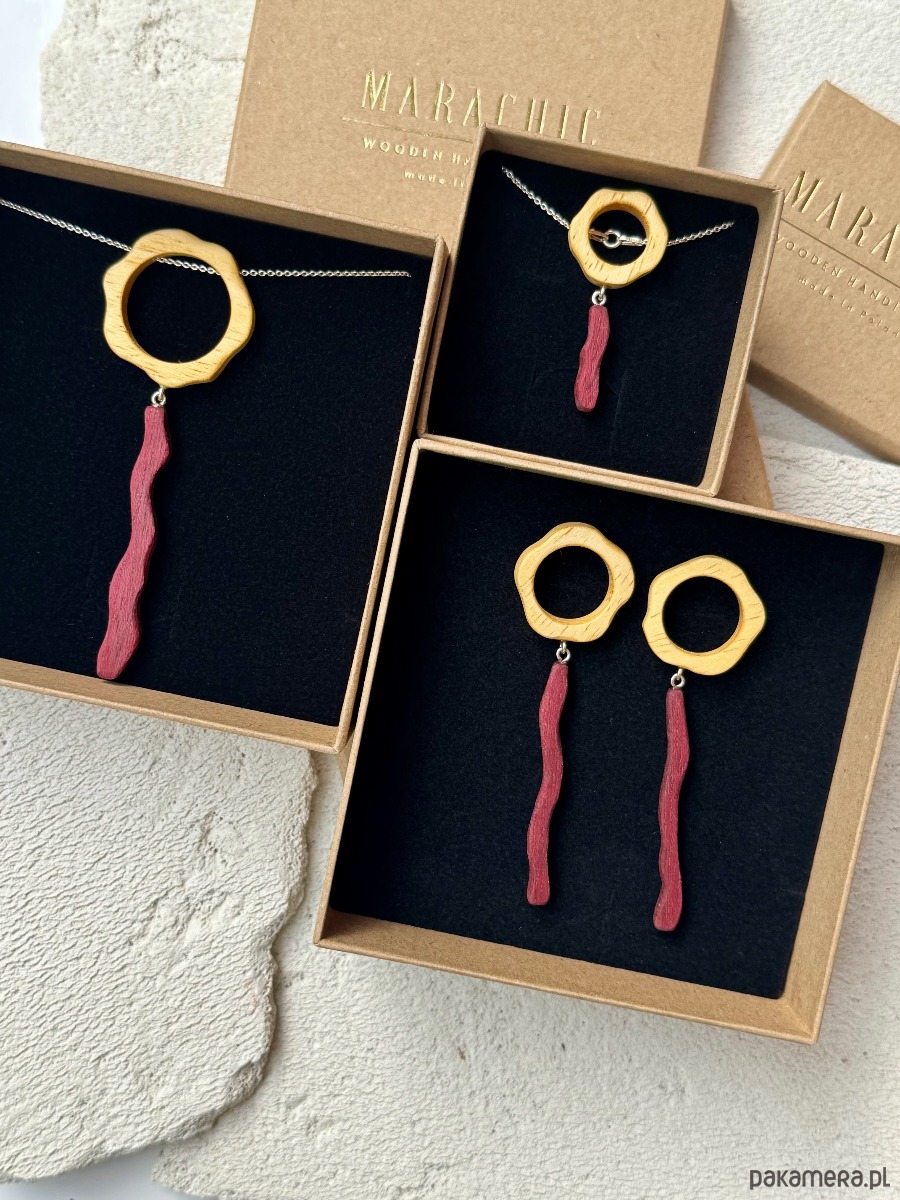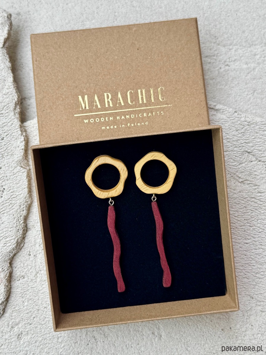Nieregularne kształty drewnianych elementów podkreślają naturalny, organiczny design i czynią każdą parę jedyną w swoim rodzaju. To połączenie gatunków drewna tworzy harmonijną kompozycję, emanującą elegancją i lekkością.