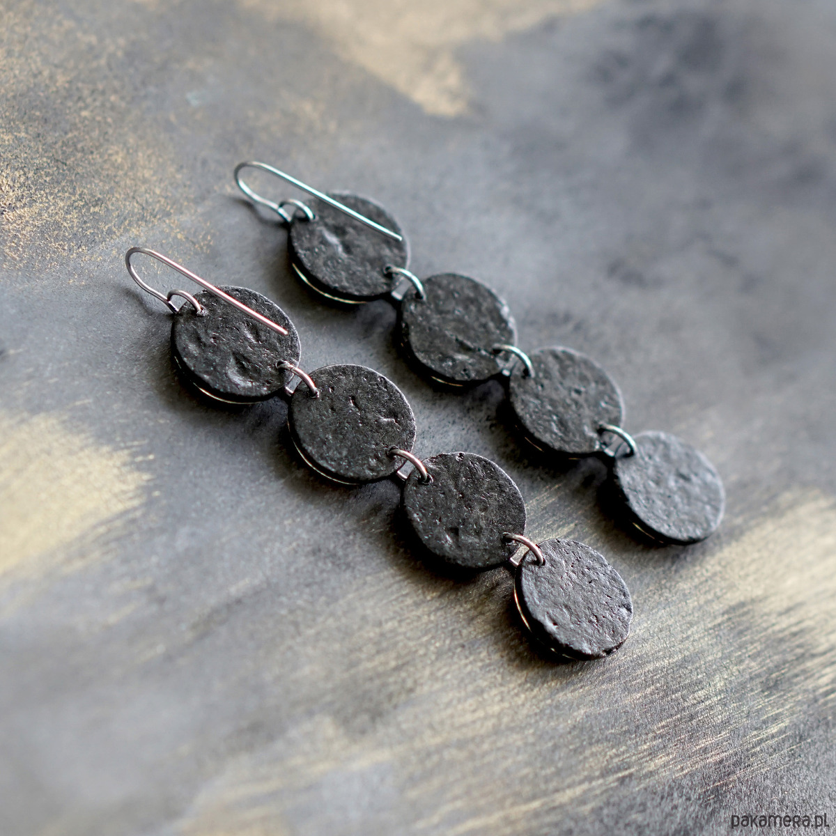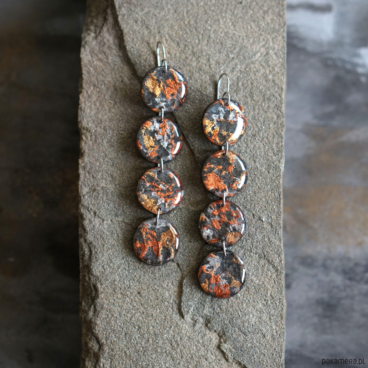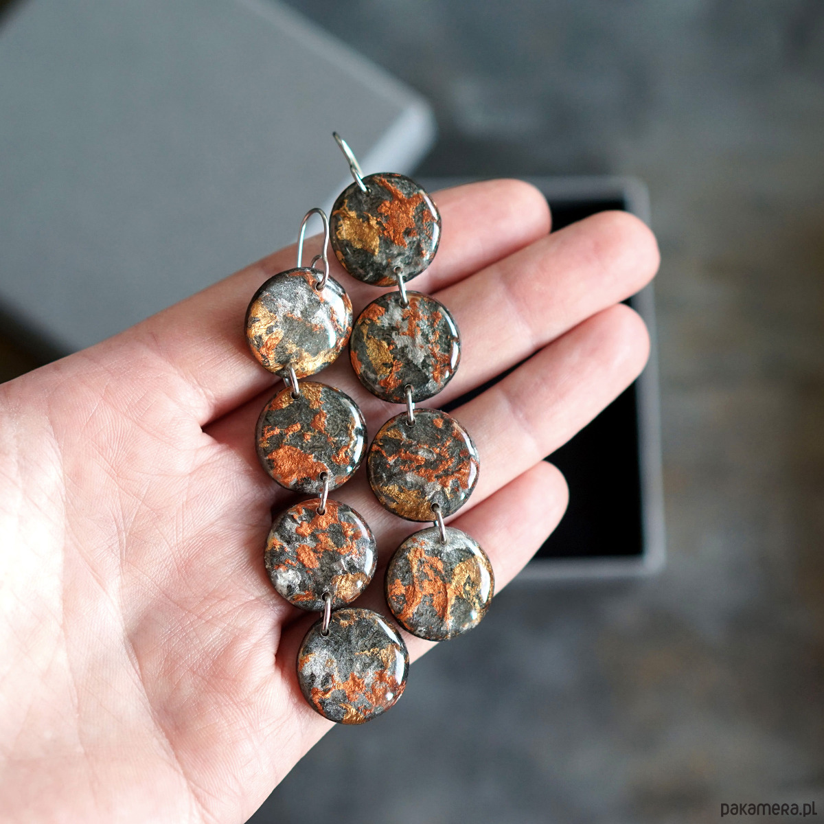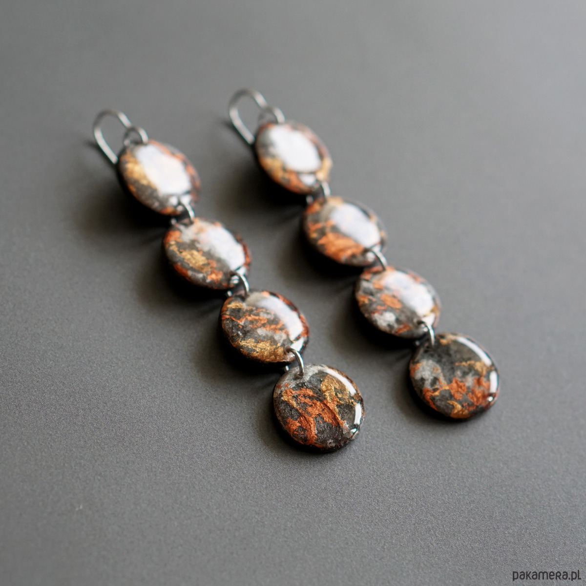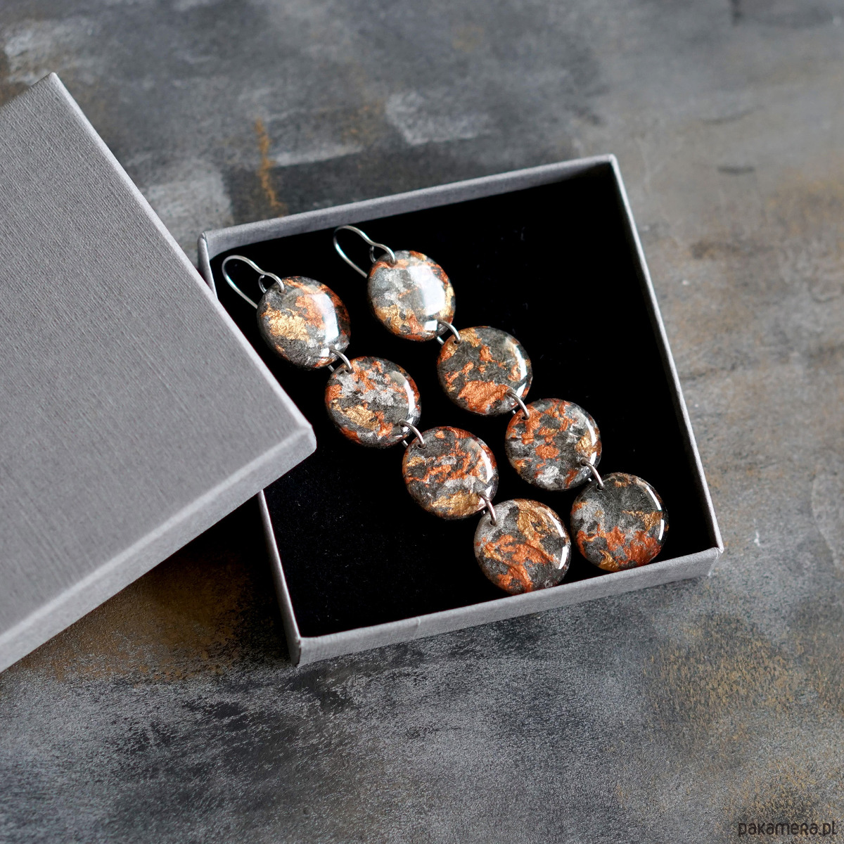 Długie, wiszące kolczyki z abstrakcyjnym wzorem wykonane ręcznie z masy papierowej.