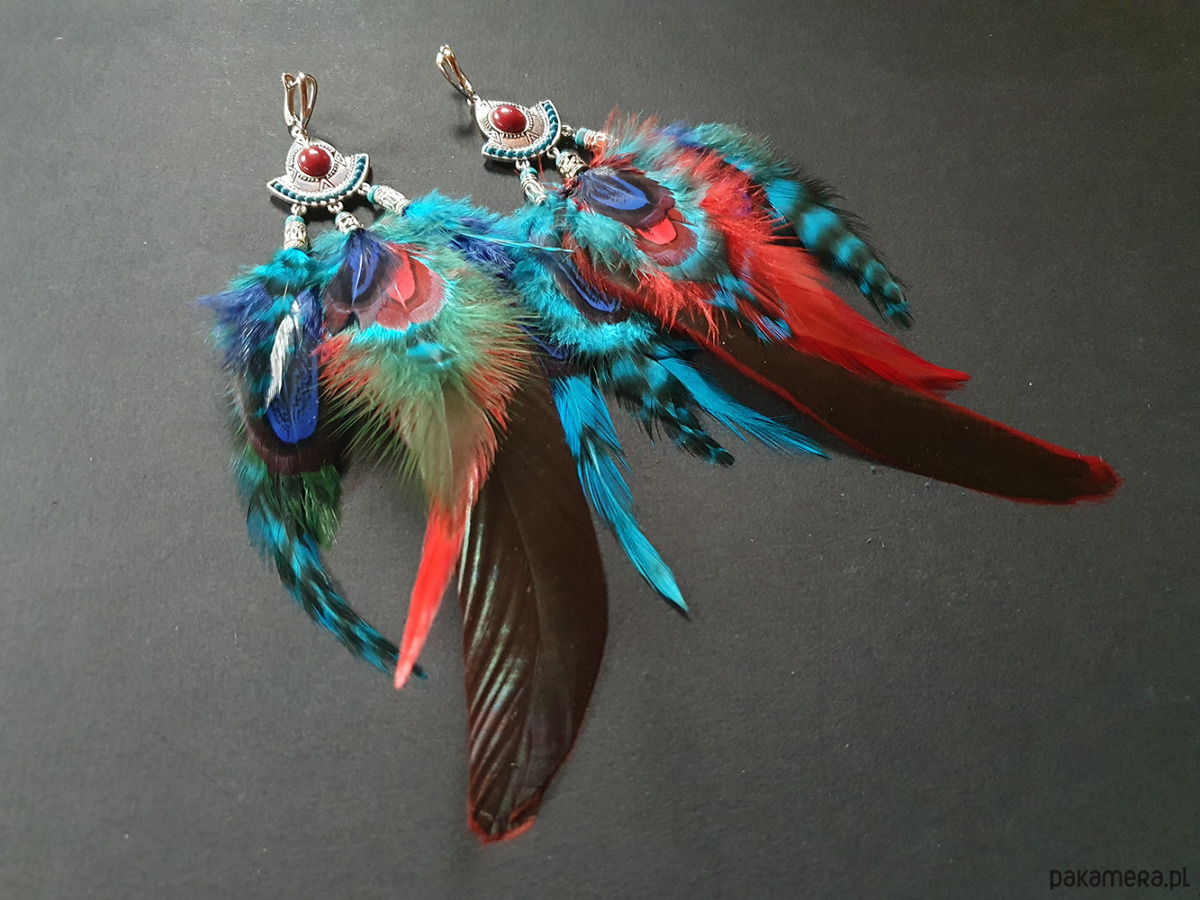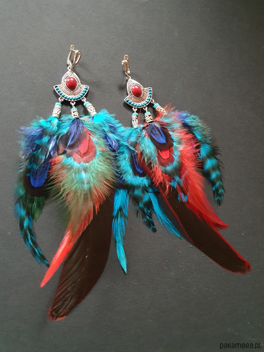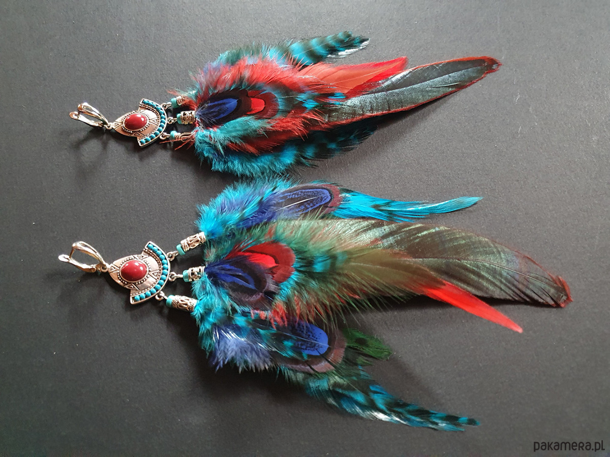 Efektowne kolorowe kolczyki z różnych gatunków egzotycznych piór naturalnych,