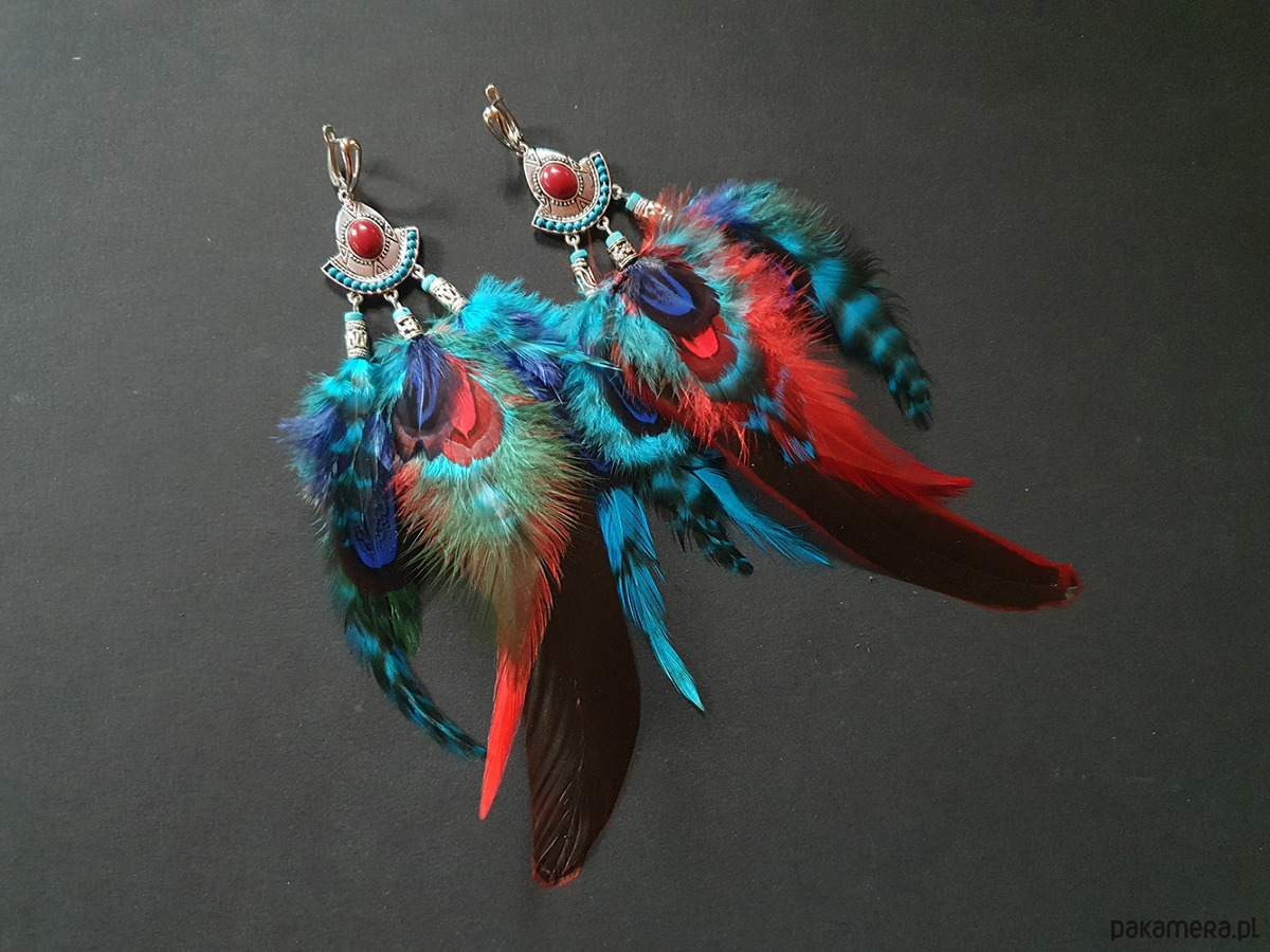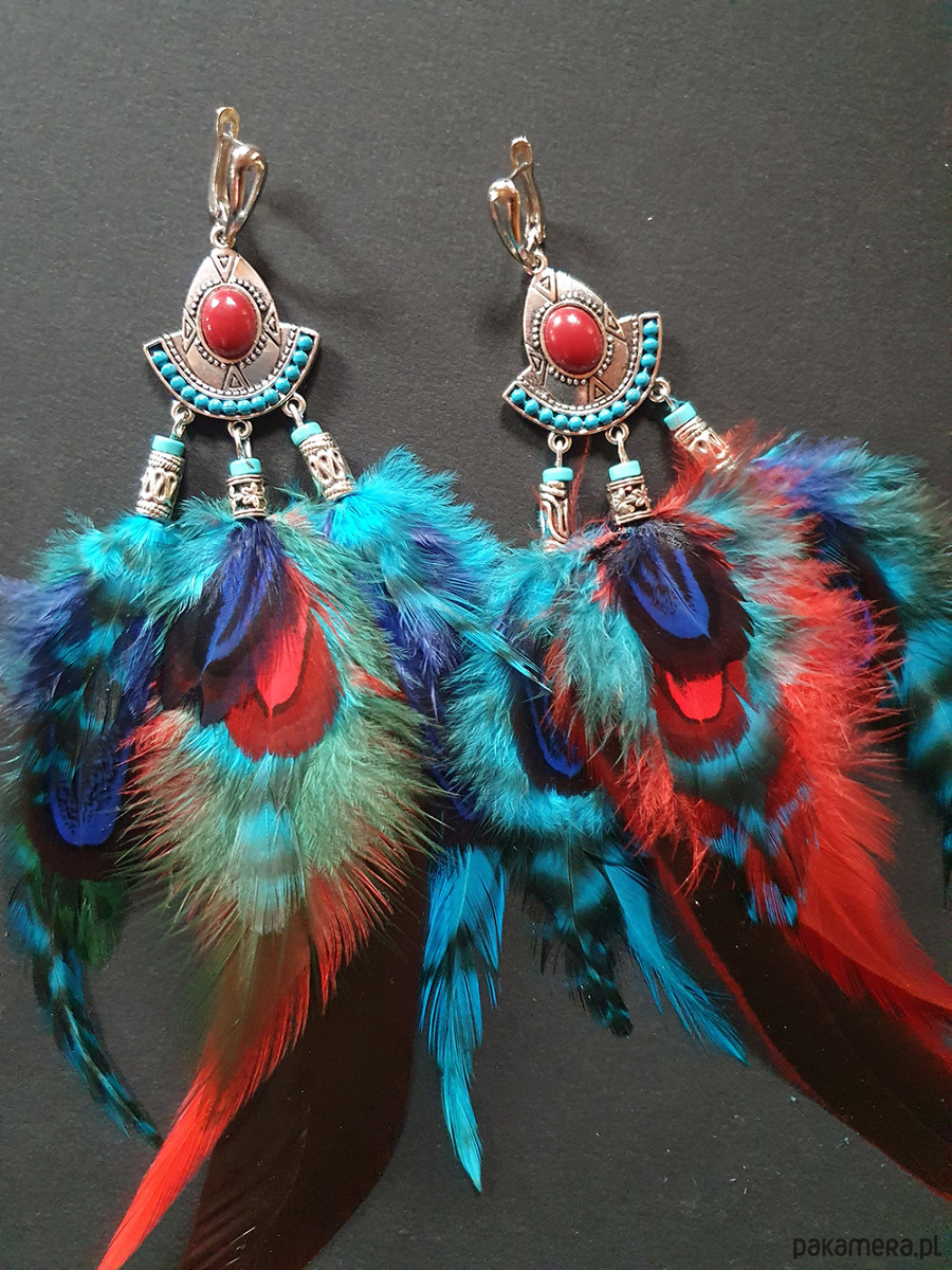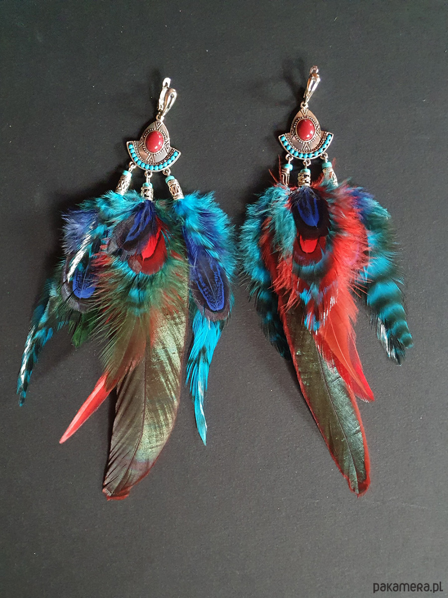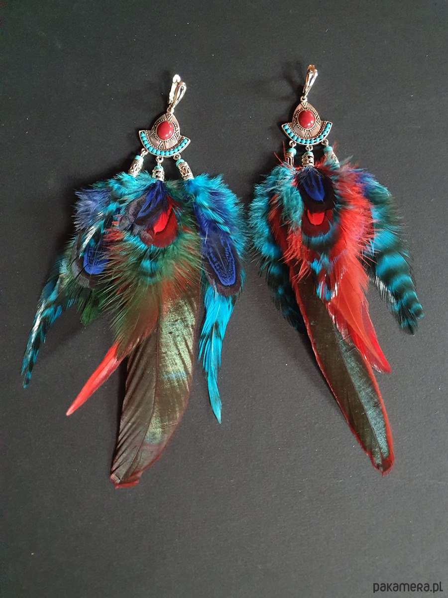 Efektowne kolorowe kolczyki z różnych gatunków egzotycznych piór naturalnych,
