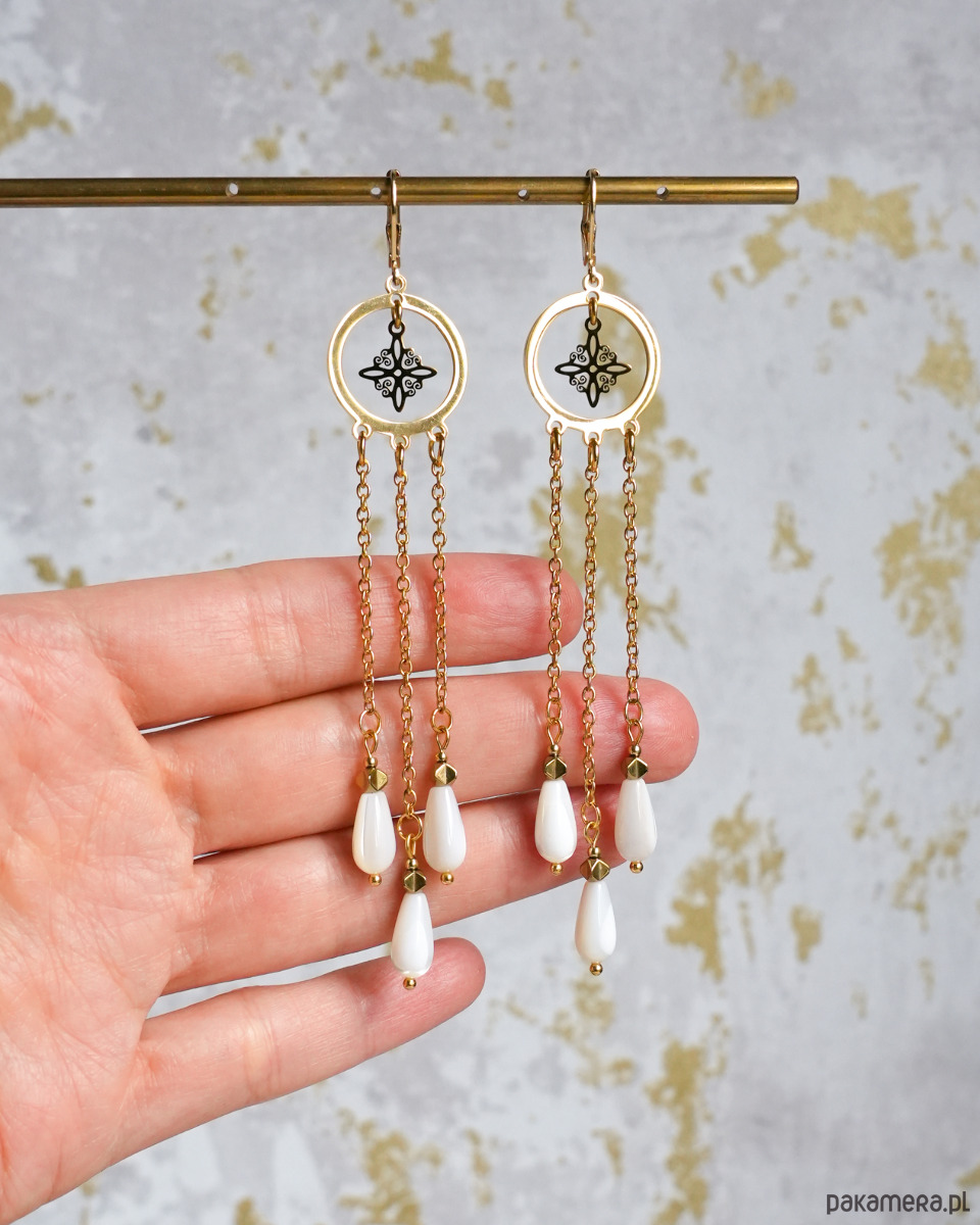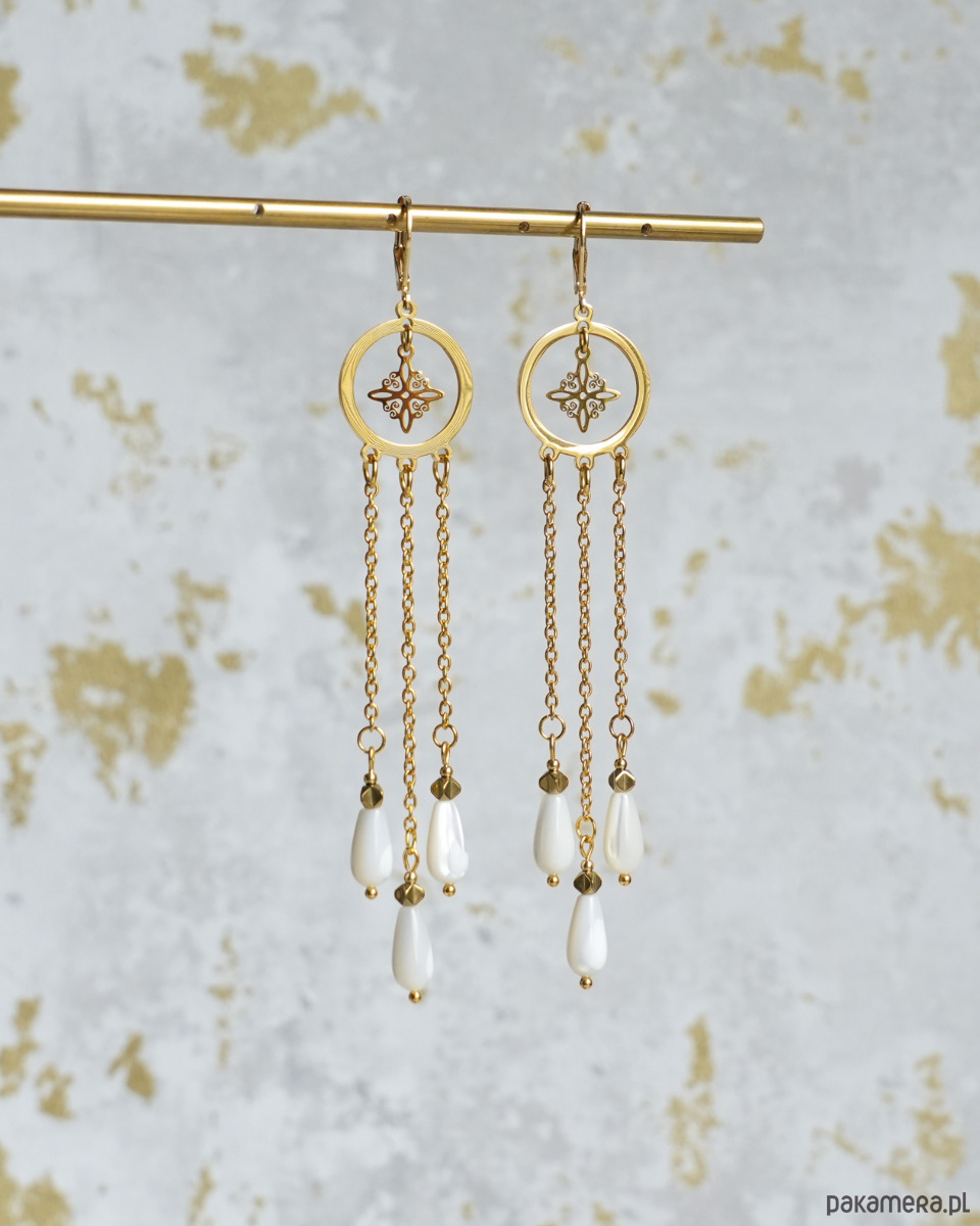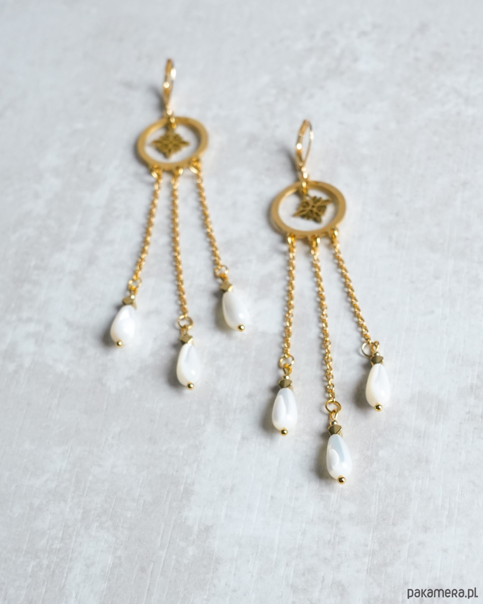 Niezwykle efektowne, długie kolczyki z delikatnymi kroplami z połyskującej MASY PERŁOWEJ i ozdobnymi, ażurowymi zawieszkami. Kolczyki są zawieszone na zamykanych biglach typu "kajdanki". Wszystkie złote elementy to STAL SZLACHETNA. Będą świetne na imprezę i wielkie wyjścia, ale też na co dzień. Na pewno będą przykuwały wzrok.