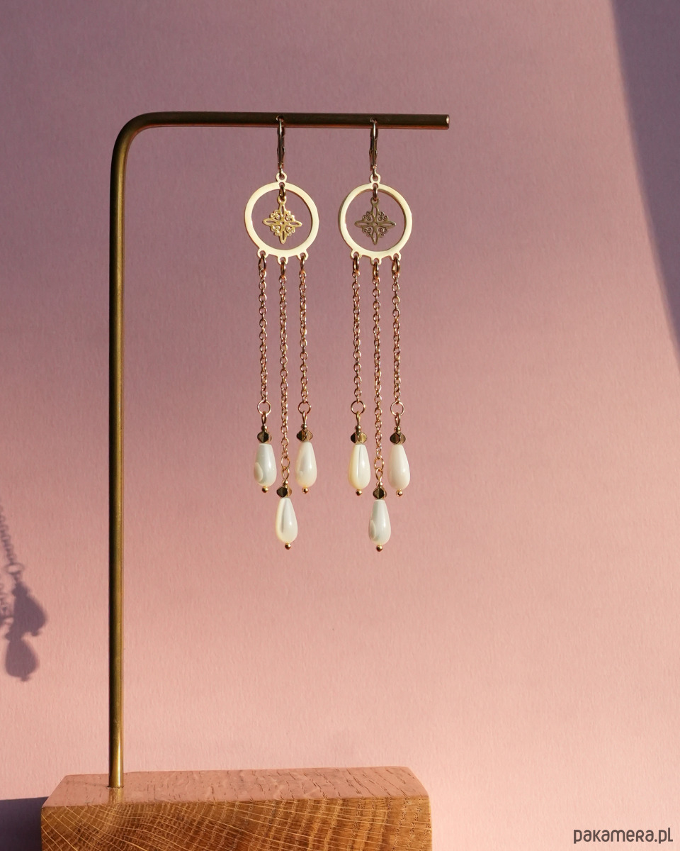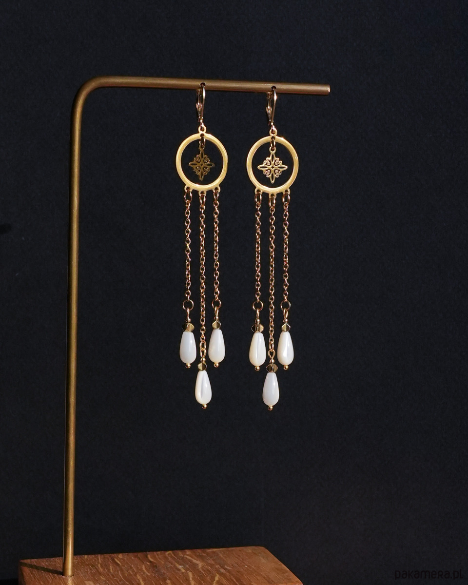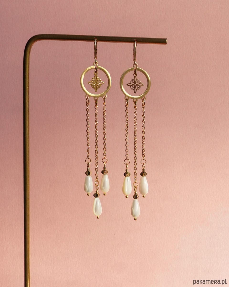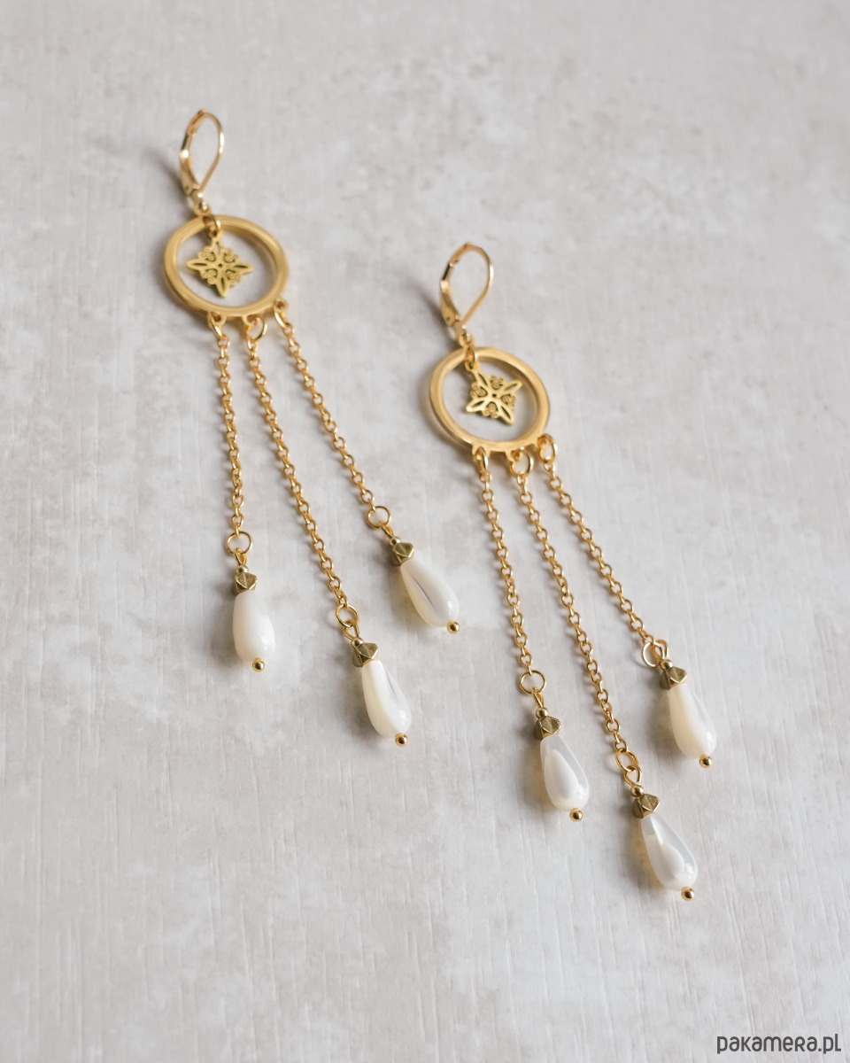 Niezwykle efektowne, długie kolczyki z delikatnymi kroplami z połyskującej MASY PERŁOWEJ i ozdobnymi, ażurowymi zawieszkami. Kolczyki są zawieszone na zamykanych biglach typu "kajdanki". Wszystkie złote elementy to STAL SZLACHETNA. Będą świetne na imprezę i wielkie wyjścia, ale też na co dzień. Na pewno będą przykuwały wzrok.
