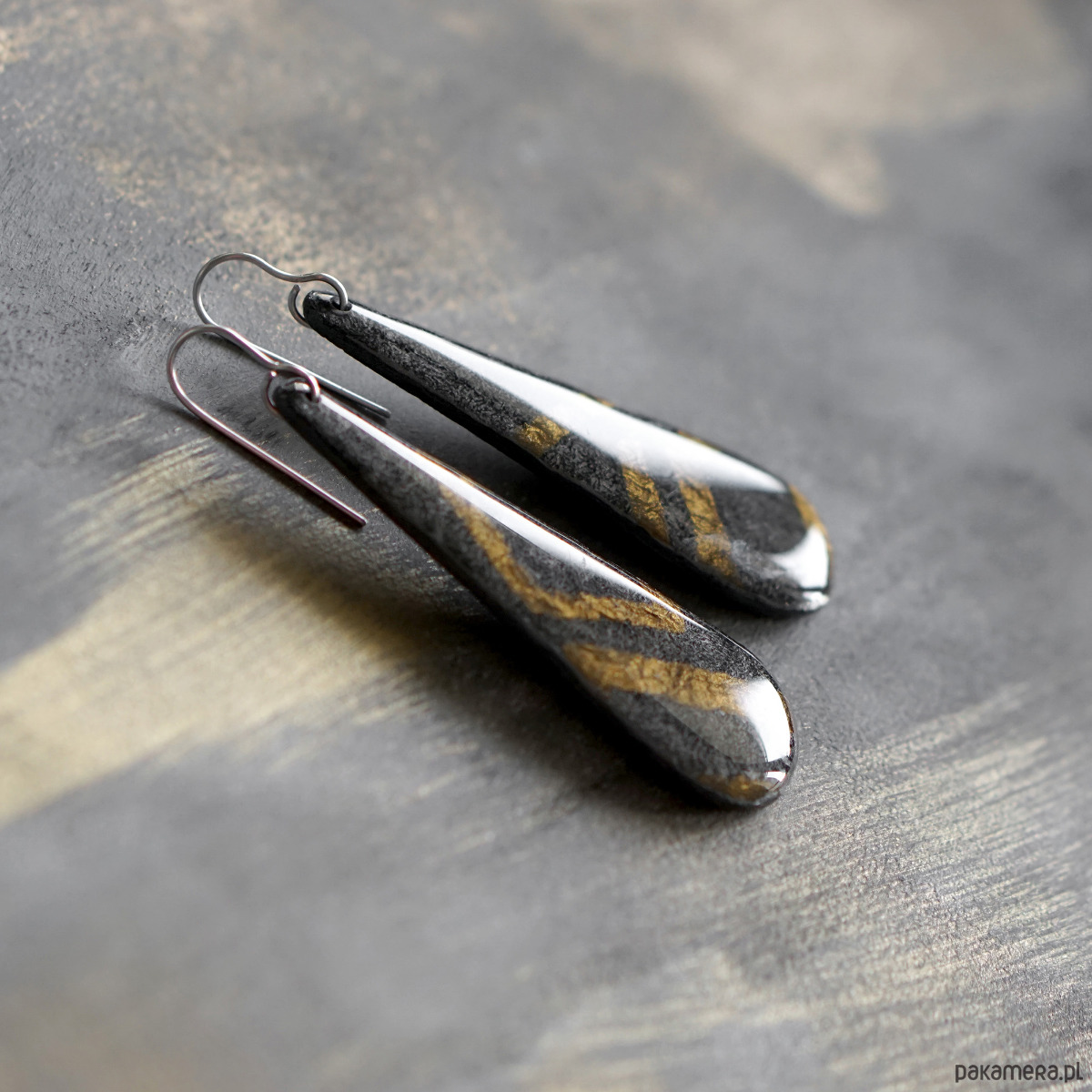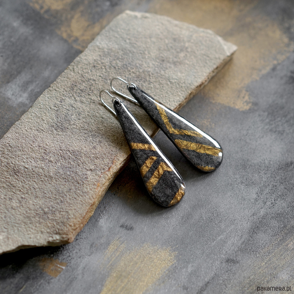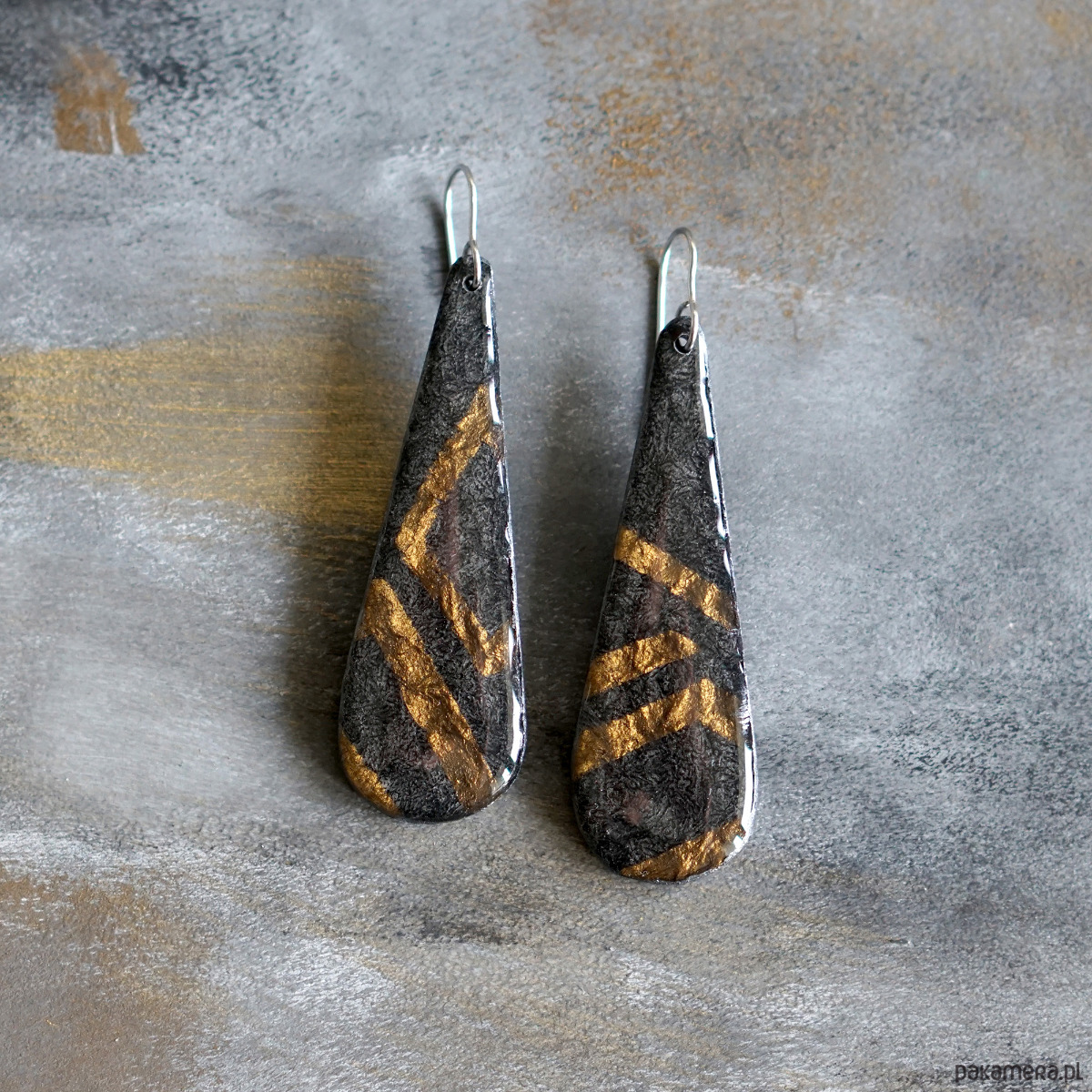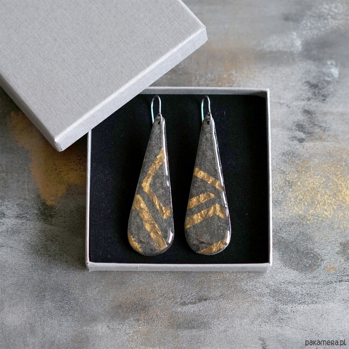 Długie wiszące kolczyki z geometrycznym wzorem wykonane z masy papierowej i żywicy.