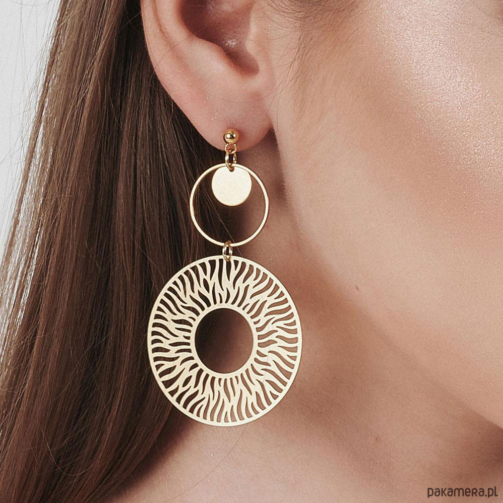 Nowoczesne kolczyki o geometrycznej formie, wykonane z mosiądzu i stali chirurgicznej. Ich ażurowa struktura przyciąga wzrok delikatnym, graficznym wzorem, który przypomina lśniące słońce i subtelnie odbija światło przy każdym ruchu. Lekka forma dodaje im elegancji i sprawia, że staną się wyrazistym akcentem każdej stylizacji – idealnym dla kobiet, które lubią połączenie minimalizmu i artystycznego charakteru.