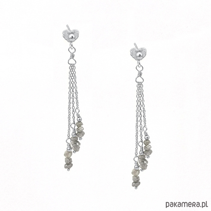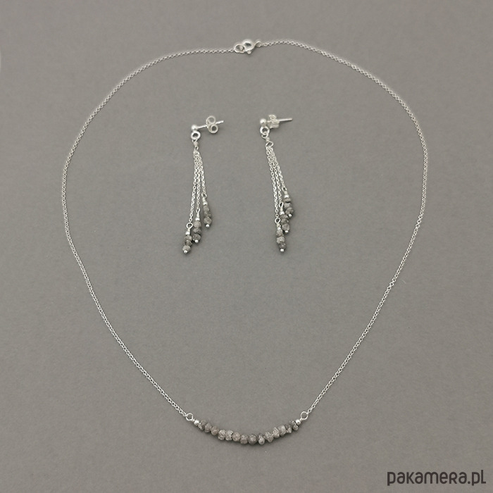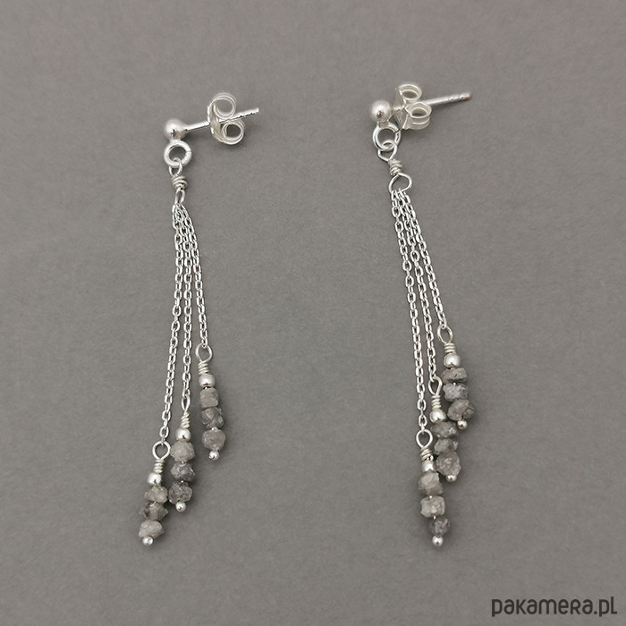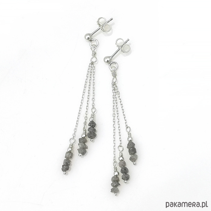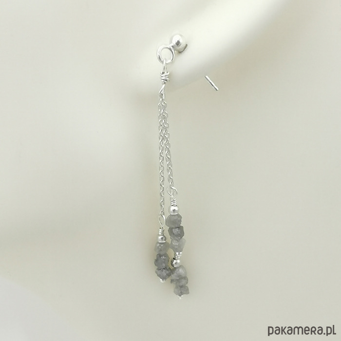 Delikatne, długie kolczyki ze srebra próby 925 z naturalnymi surowymi szarymi diamentami (3mm). Kamienie mają nieregularne kształty.