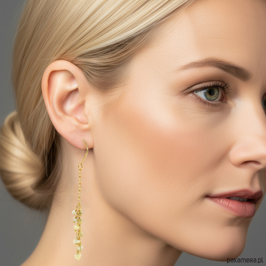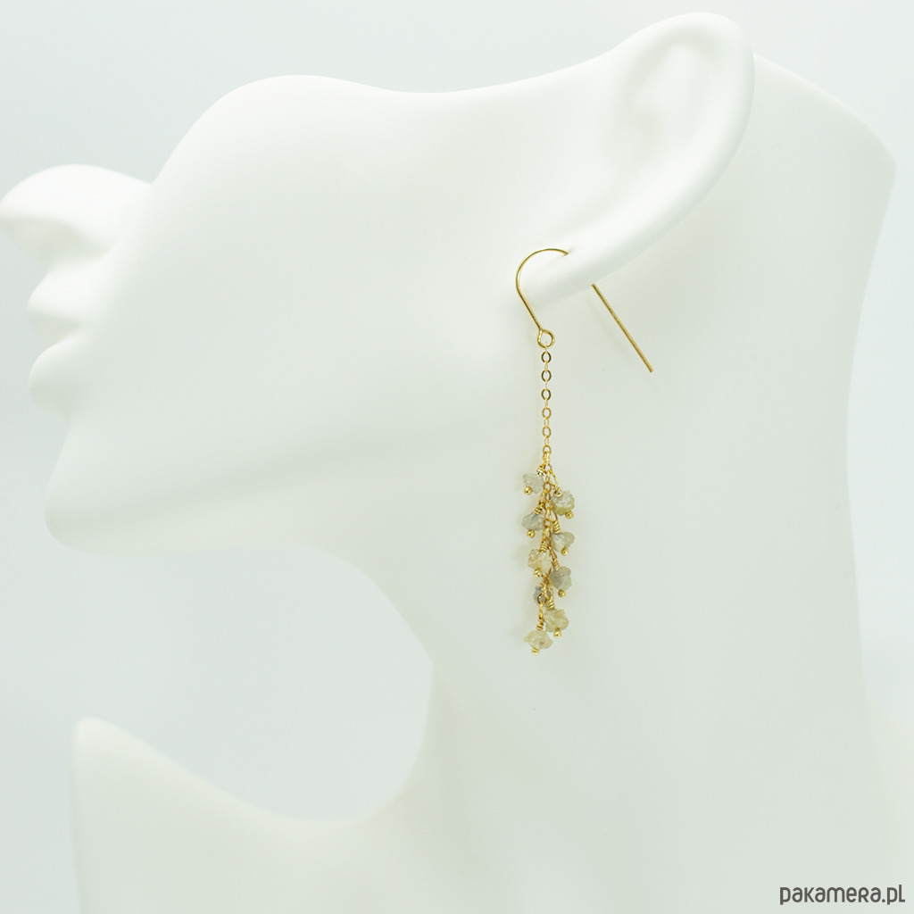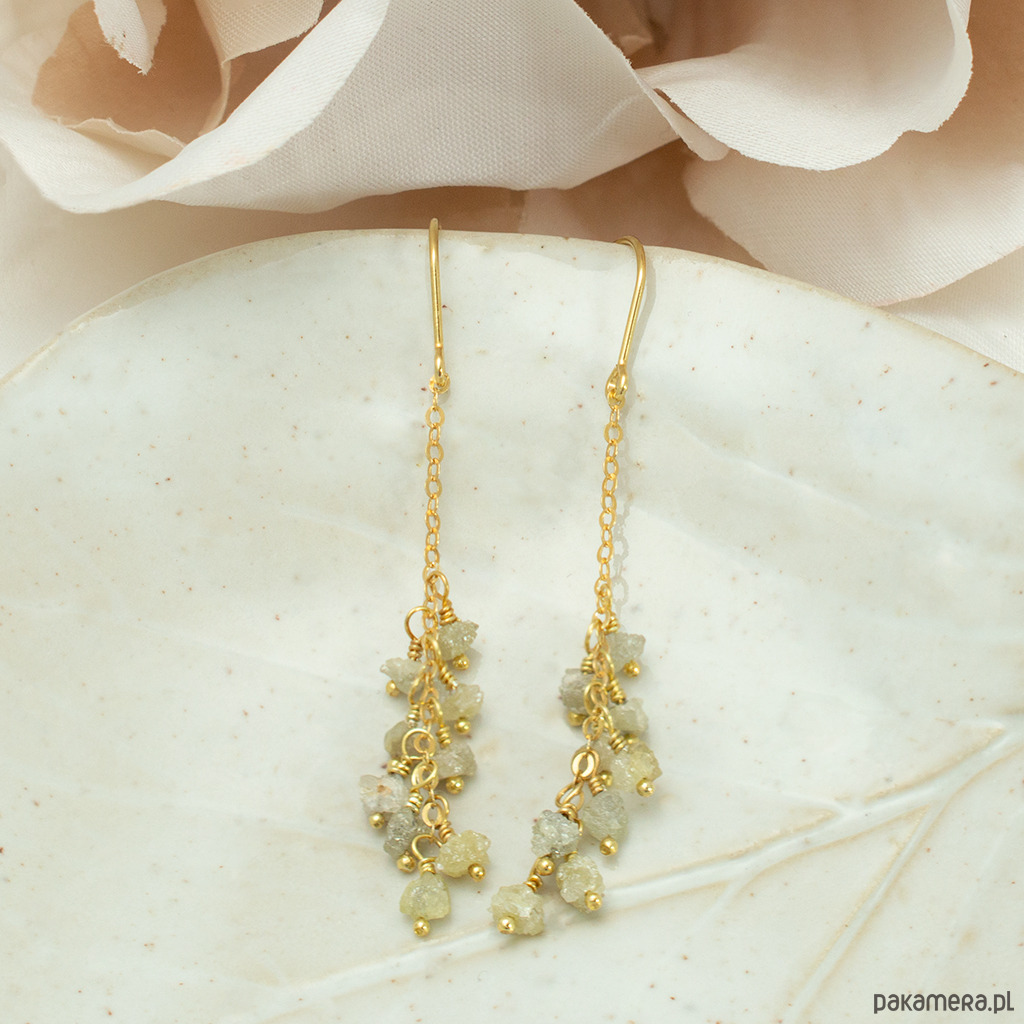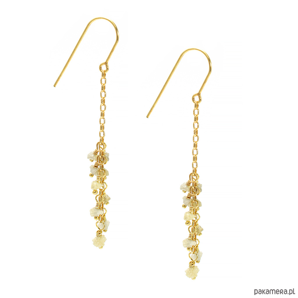 Długie, efektowne kolczyki gronka z naturalnymi, surowymi diamentami w kolorze żółtym. Na wygodnych biglach haczykach, dobrze trzymają się na uszach.