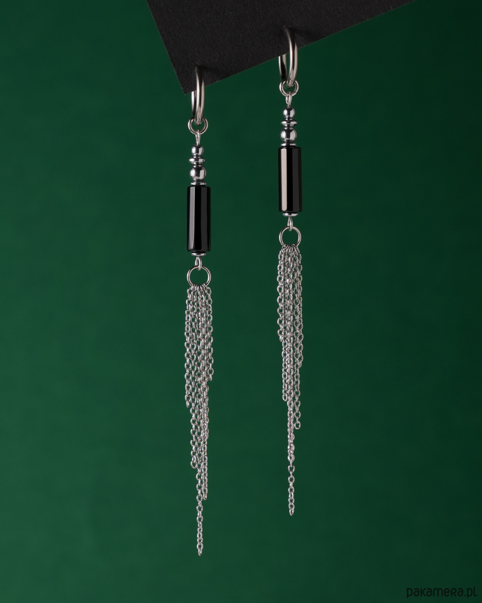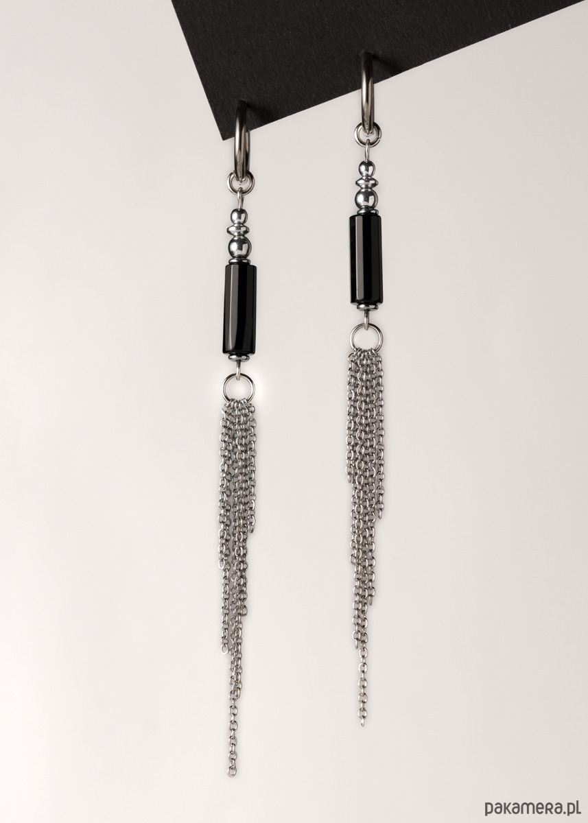Długie i efektowne kolczyki z łańcuszkami, czarnym ONYKSEM w kształcie wałeczków o fasetowanym szlifie oraz srebrnym HEMATYTEM, zawieszone na zamykanych, okrągłych biglach. Wszystkie metalowe elementy to srebrna STAL SZLACHETNA.