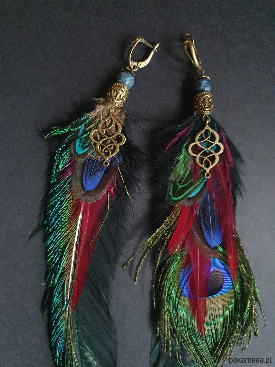 Efektowne kolorowe kolczyki z różnych gatunków egzotycznych piór naturalnych,