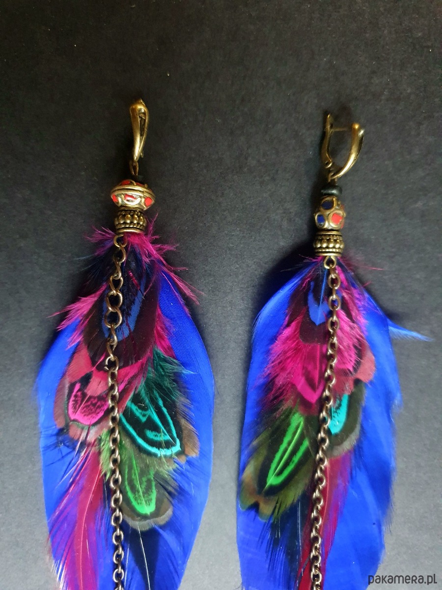 Efektowne kolorowe kolczyki z różnych gatunków egzotycznych piór naturalnych,