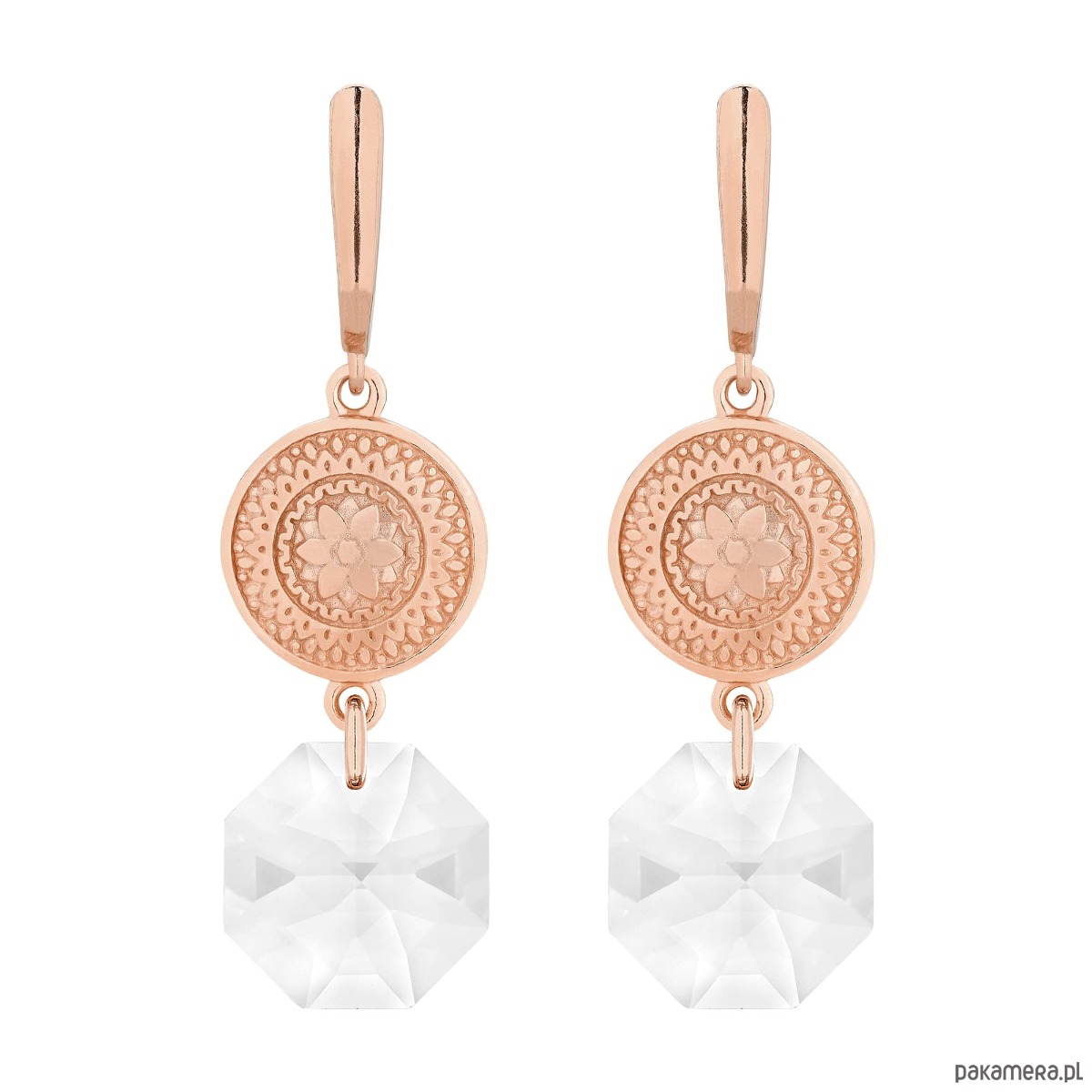 Złote kolczyki wykonane z medalionów i kryształów SWAROVSKI® CRYSTAL w kolorze Crystal. Całość wykonana ze srebra 925 powlekanego 18 karatowym różowym złotem. Zapinane na bigle angielskie.