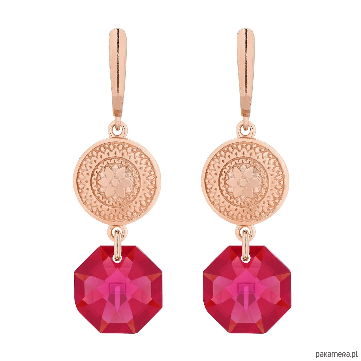 Złote kolczyki wykonane z medalionów i kryształów SWAROVSKI® CRYSTAL w kolorze Bordeaux. Całość wykonana ze srebra 925 powlekanego 18 karatowym różowym złotem. Zapinane na bigle angielskie.