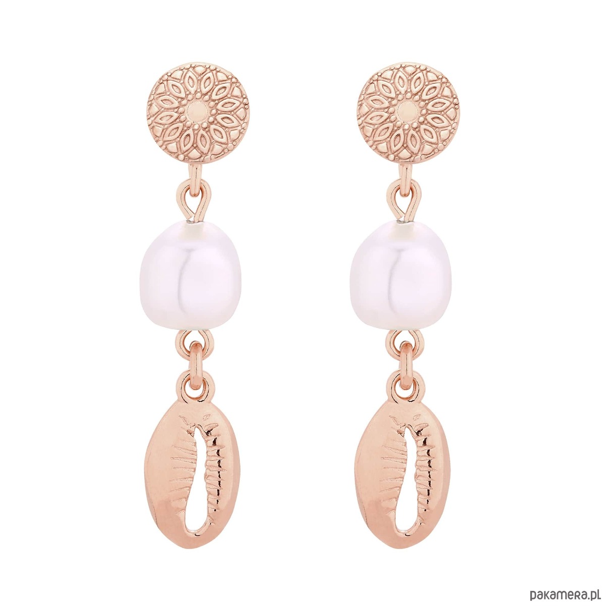Złote kolczyki wykonane z muszelek i pereł SWAROVSKI® CRYSTAL w kolorze White. Całość wykonana ze srebra 925 powlekanego 18 karatowym różowym złotem. Zapinane na sztyfty.
