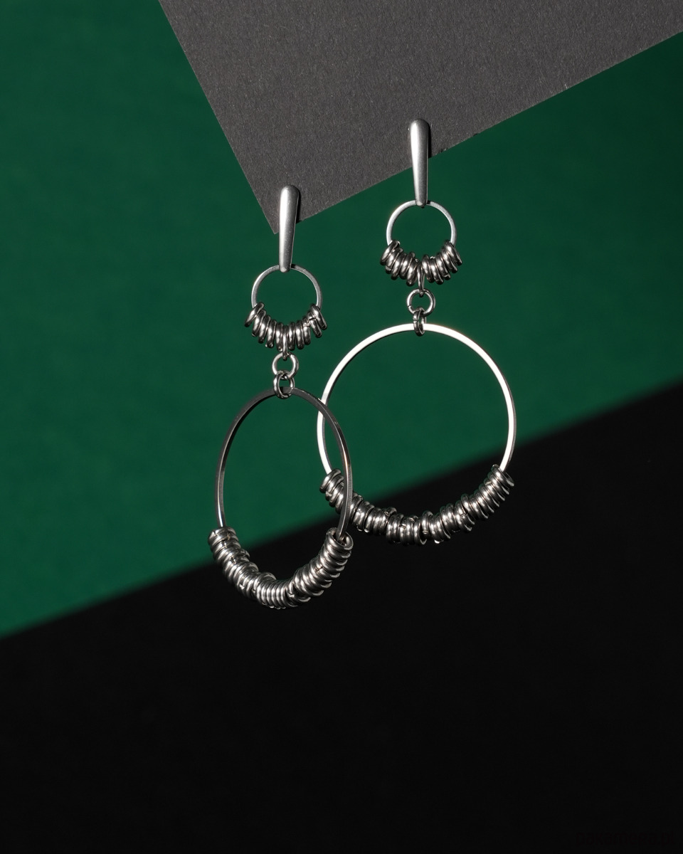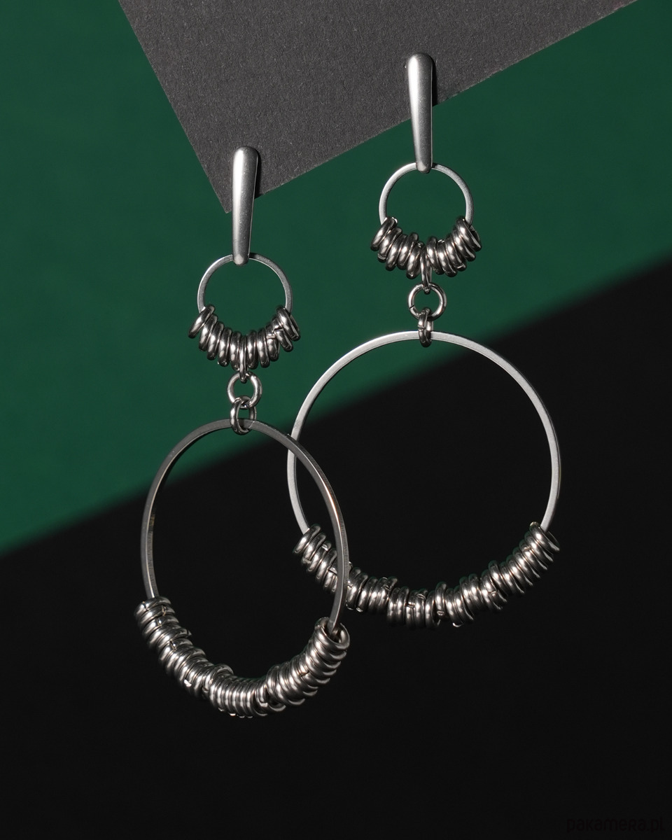Duże kolczyki z kółkami zawieszonymi na podłużnych sztyftach, w całości wykonane ze STALI SZLACHETNEJ. Propozycja dla kobiet, które lubią oryginalną, wyrazistą i nieco "surową" biżuterię. Idealne do rockowych stylizacji.