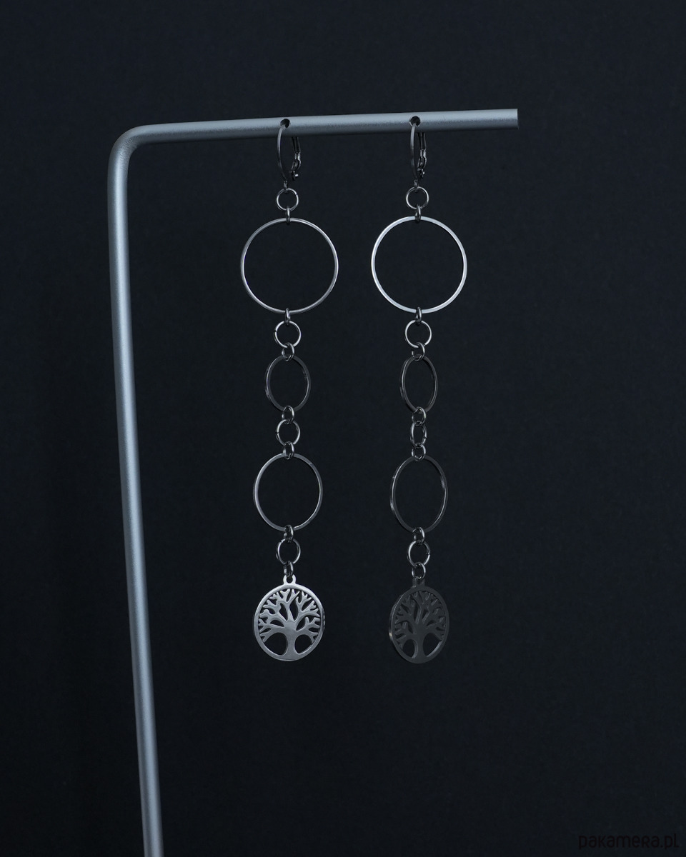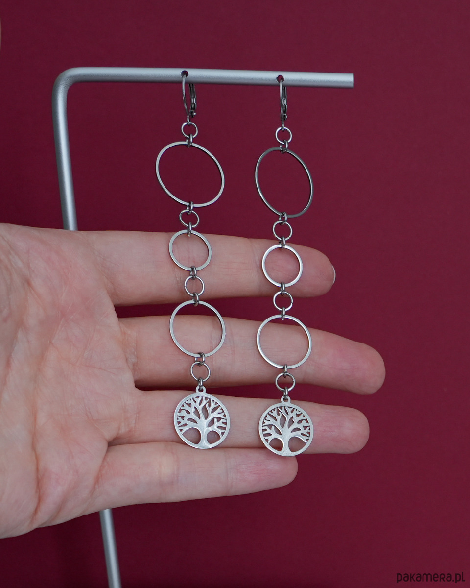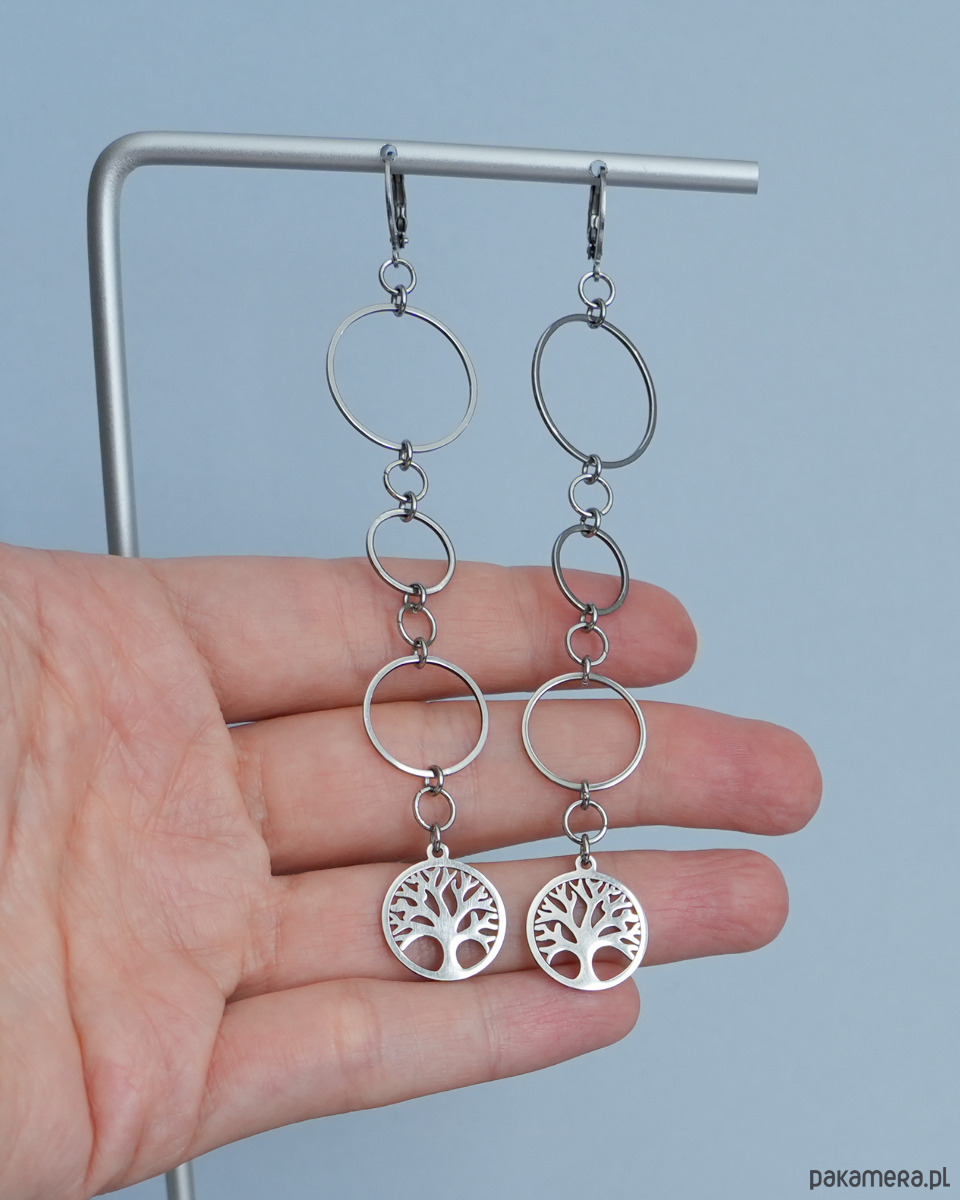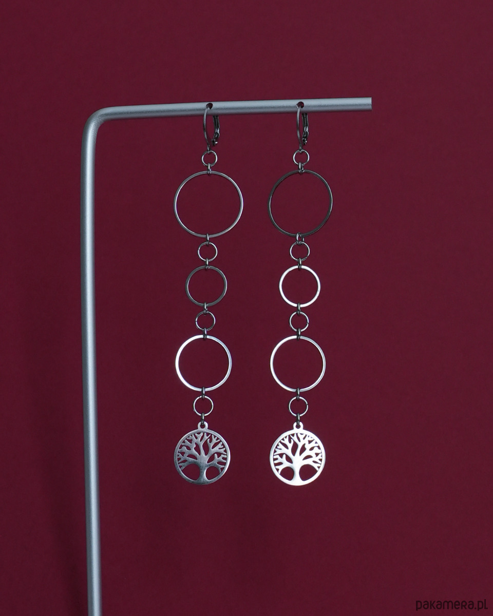 Długie kolczyki ze stali z kółkami i drzewem życia