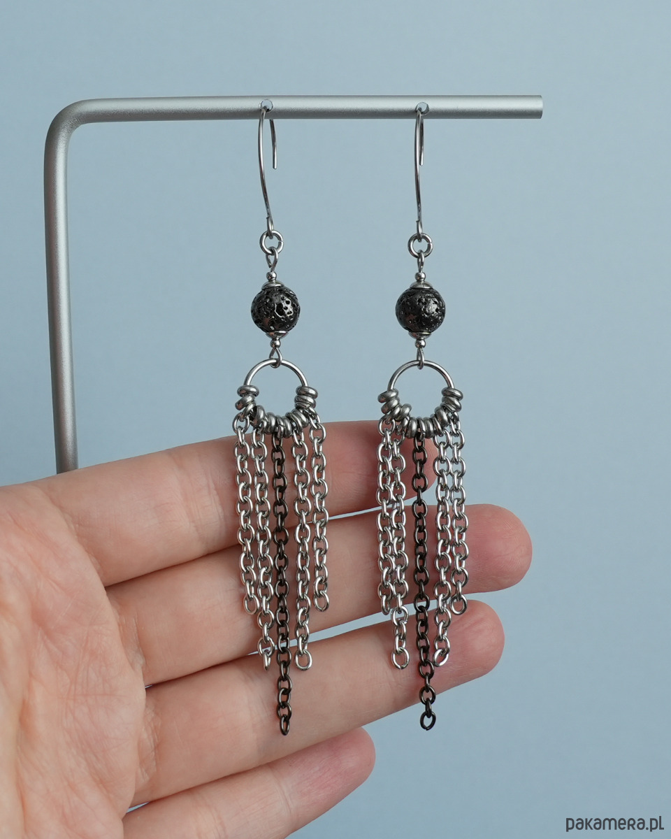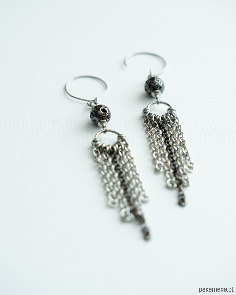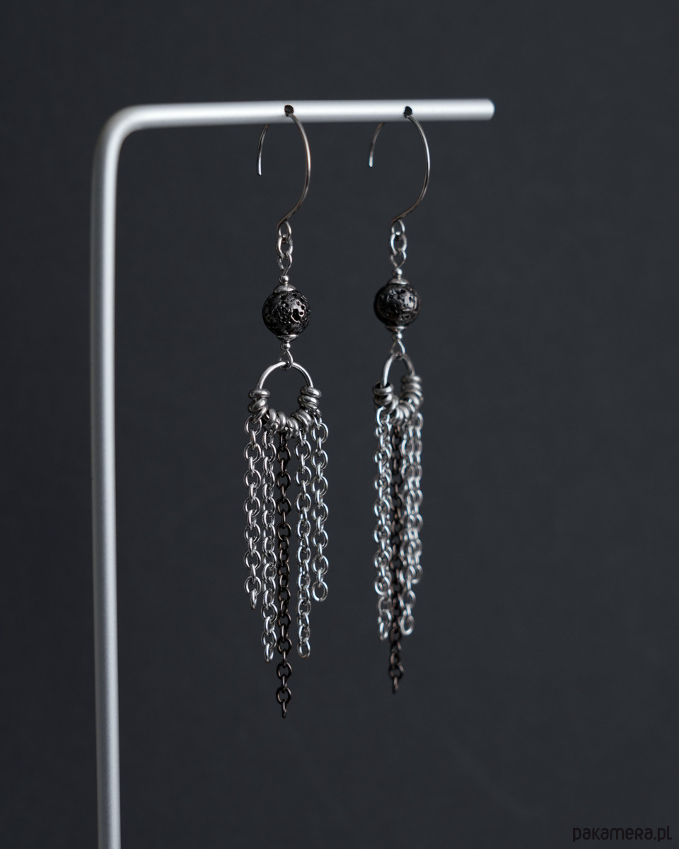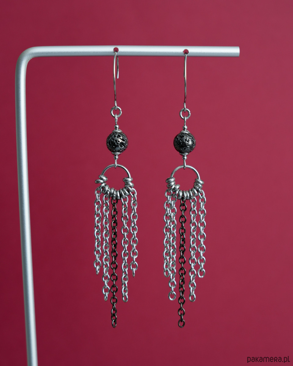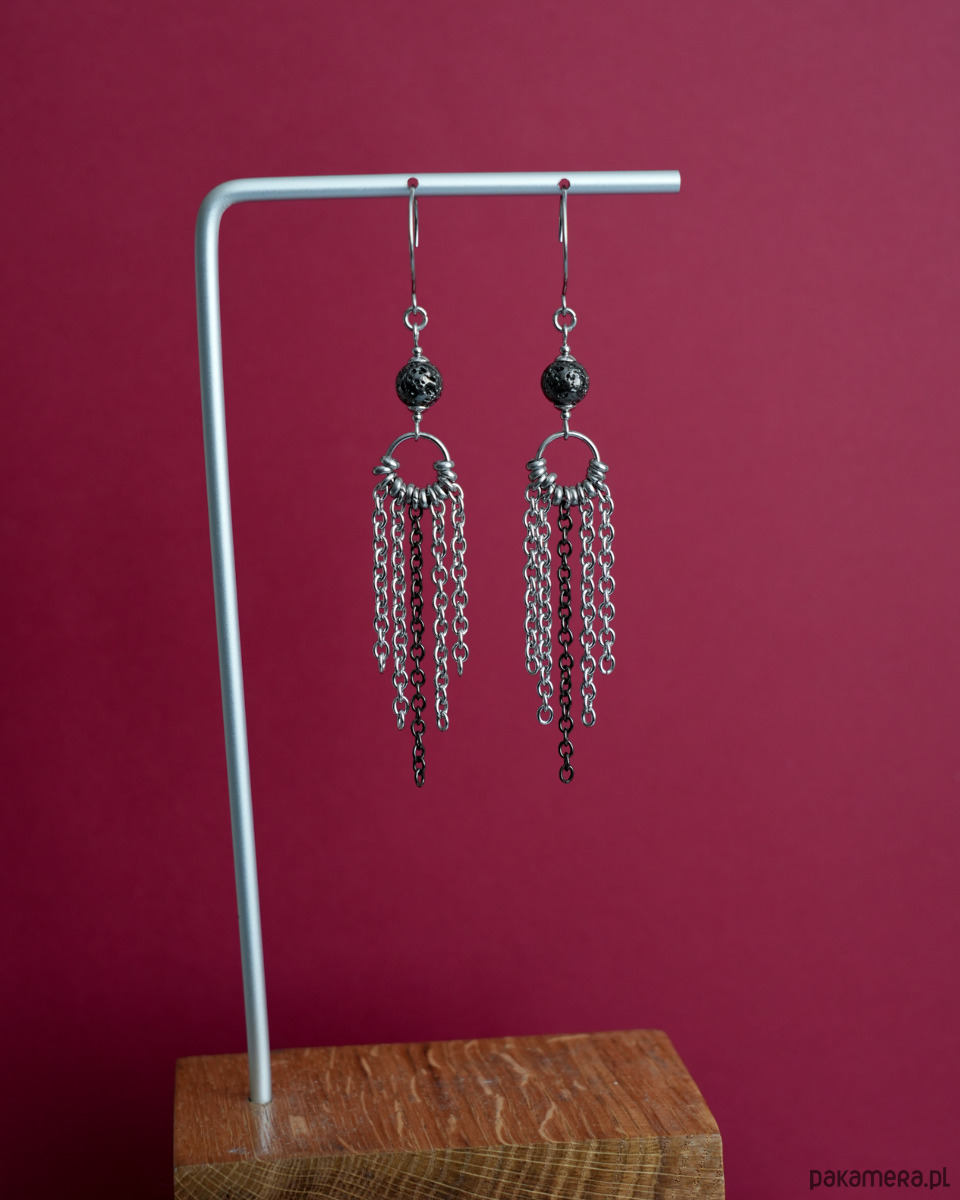 Długie i efektowne kolczyki z łańcuszkami i LAWĄ WULKANICZNĄ barwioną na metaliczny grafit. Metalowe elementy to STAL SZLACHETNA. Propozycja dla kobiet, które lubią wyrazistą i konkretną biżuterię.