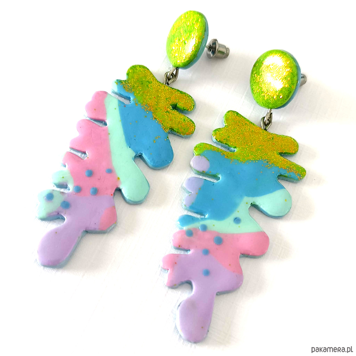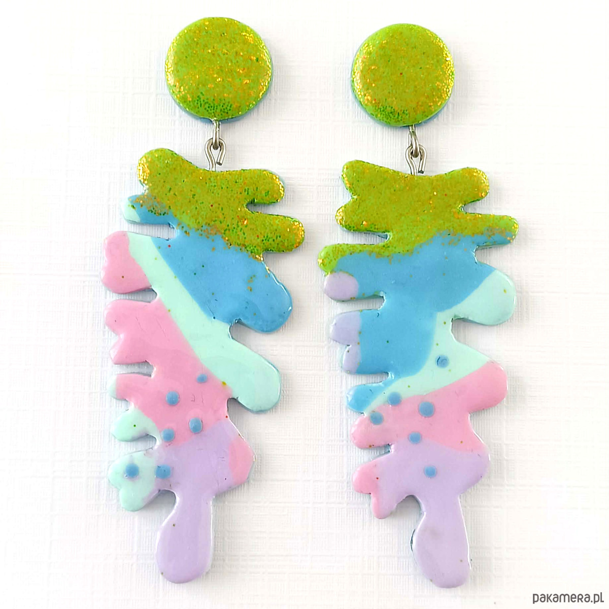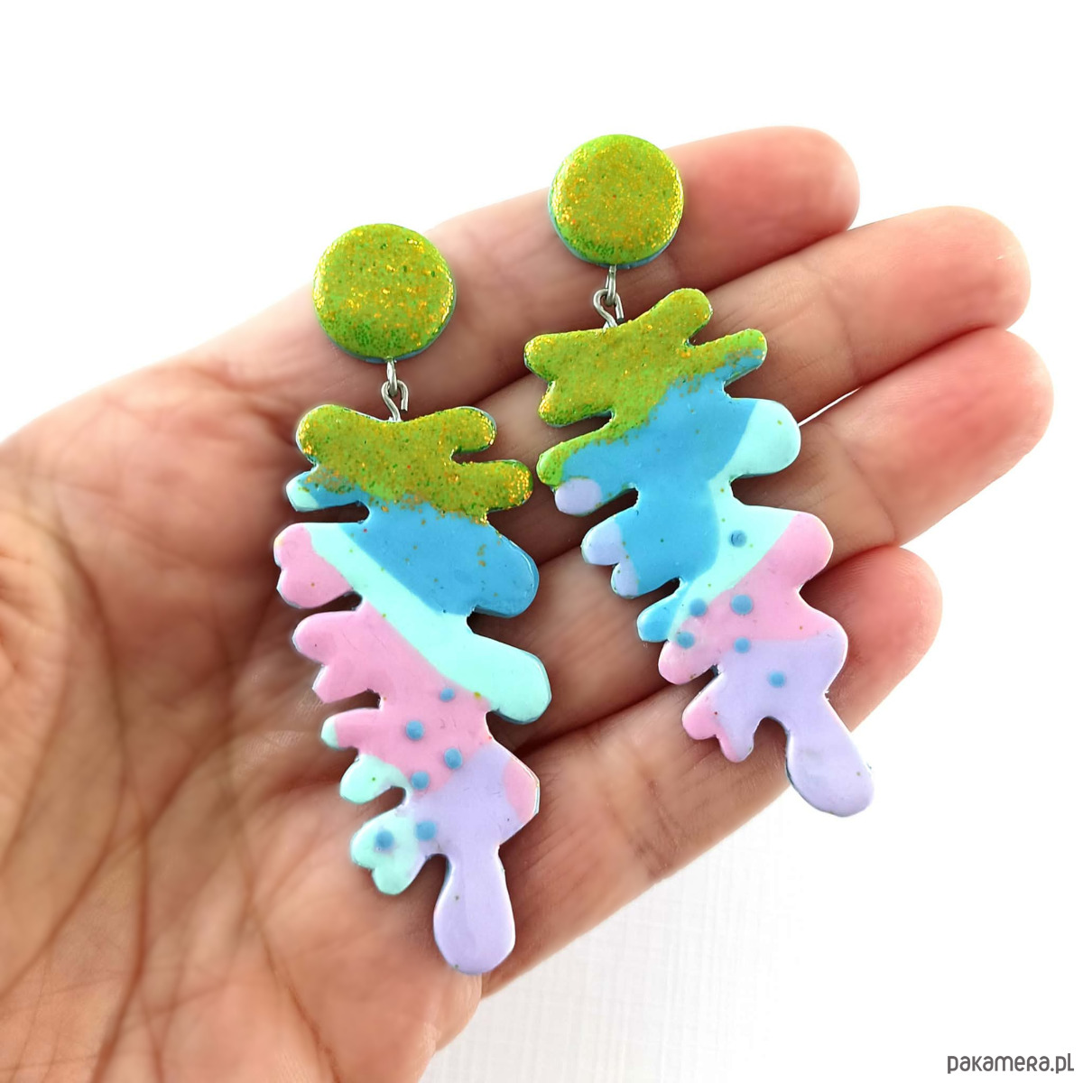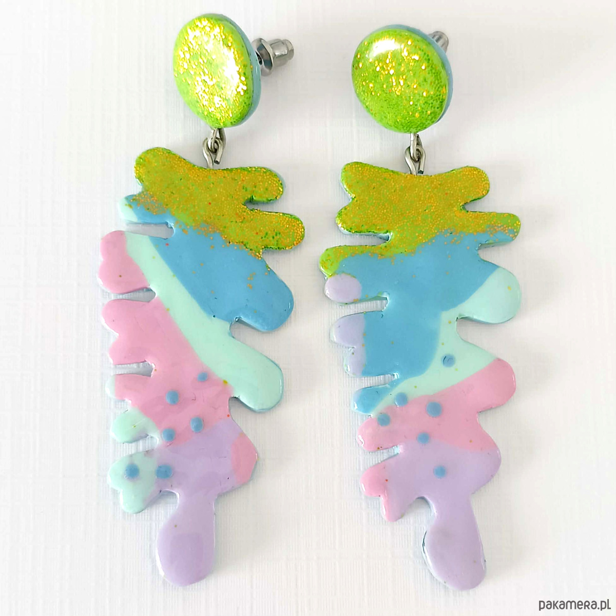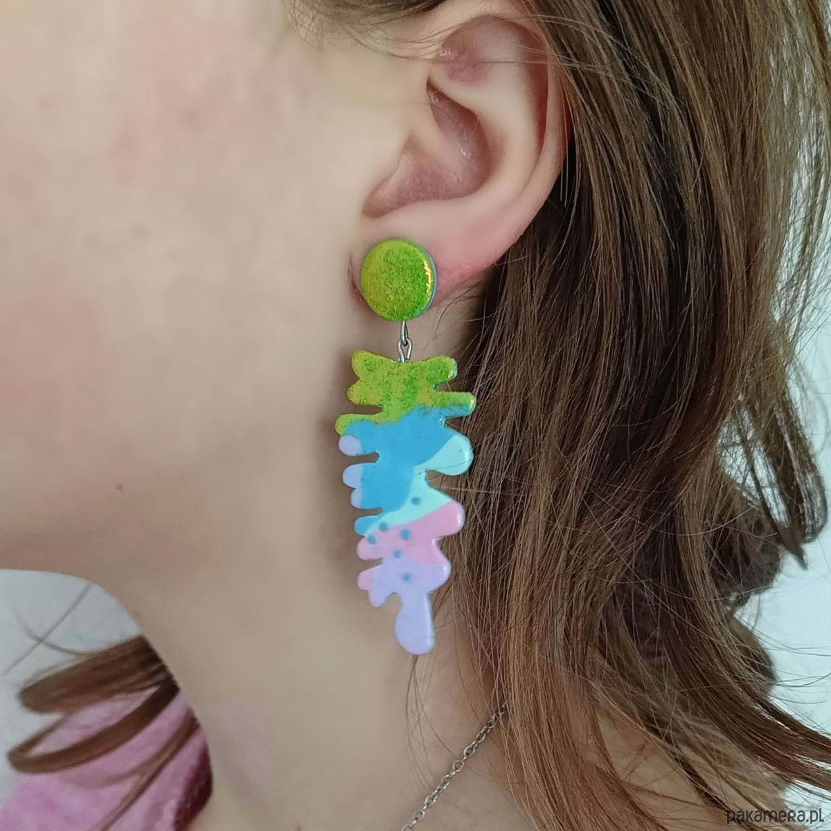 Kolczyki przyciągają uwagę intensywnymi kolorami i organiczną, malarską formą. Błyszczący zielony element u góry pięknie odbija światło, a kolorowa kompozycja tworzy efekt małego dzieła sztuki do noszenia.