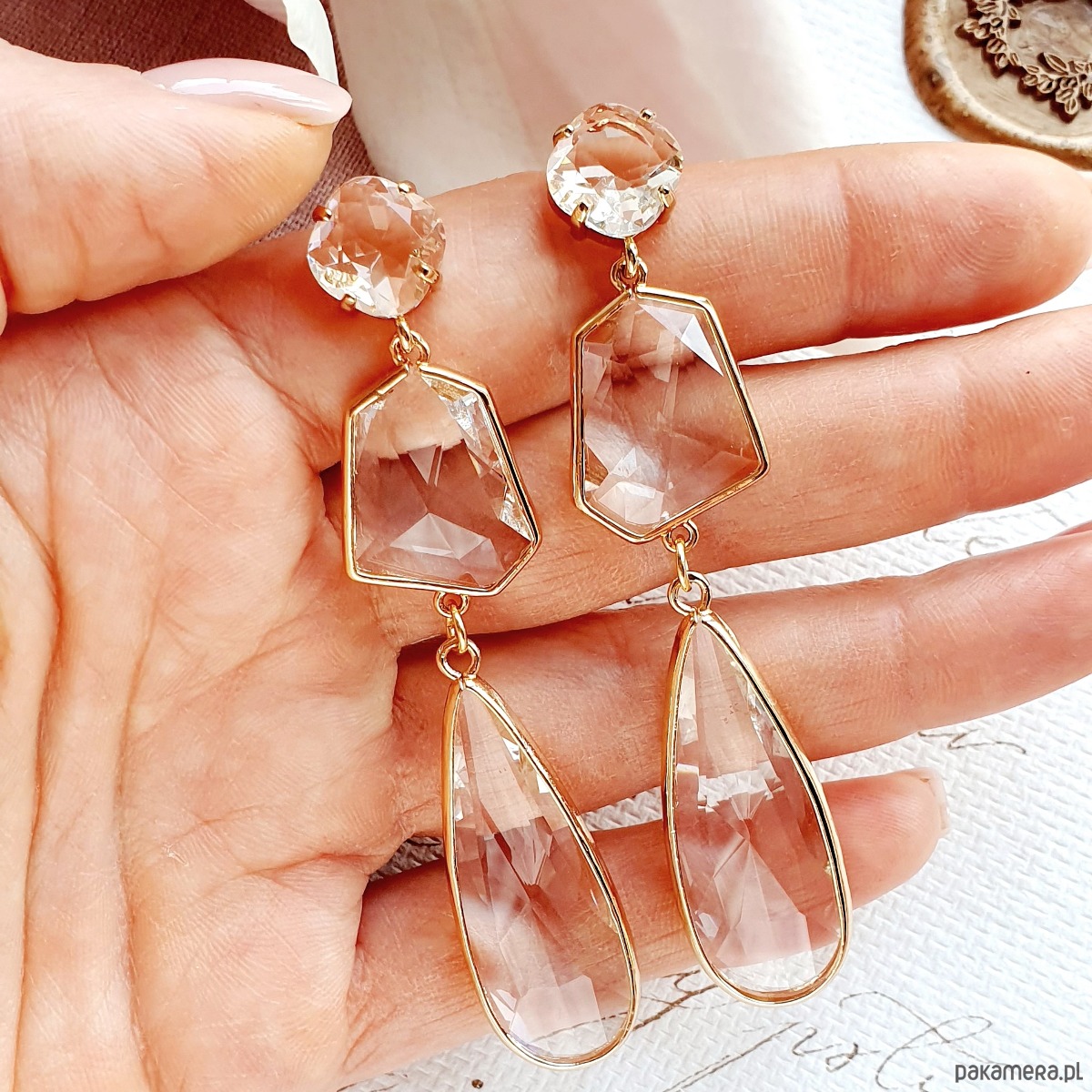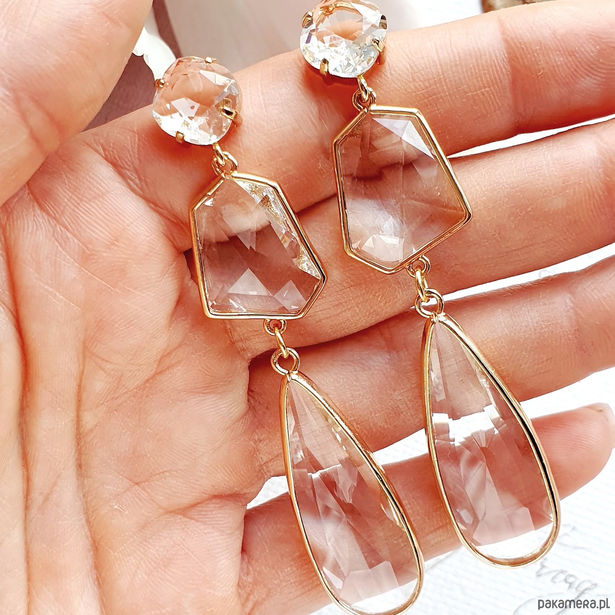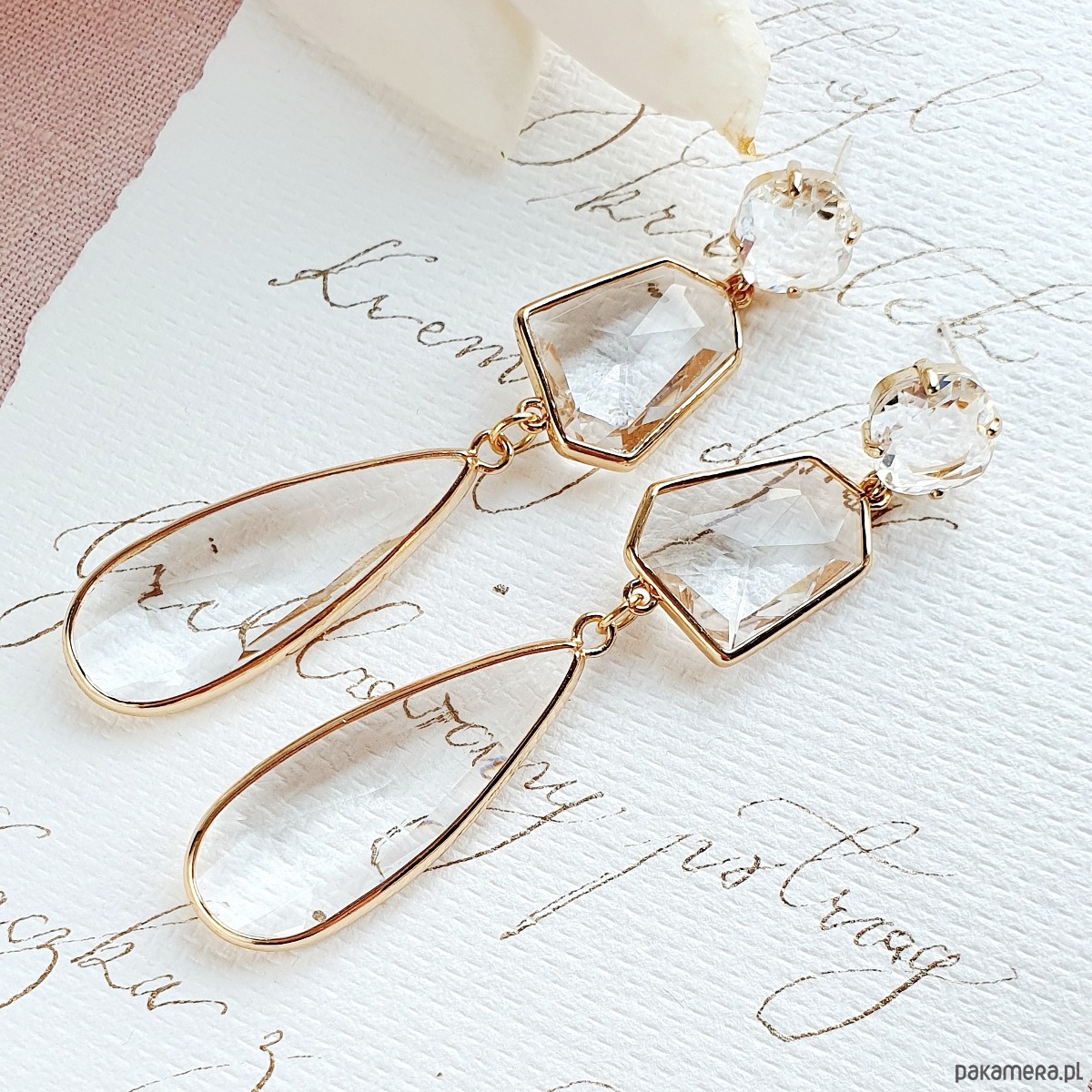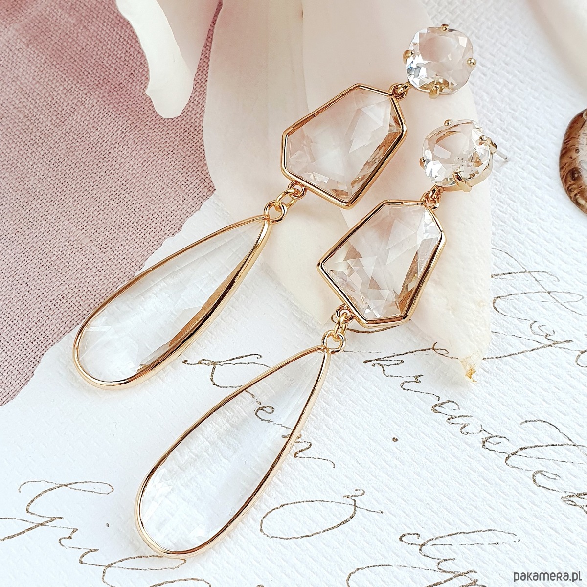 Długie, geometryczne kolczyki ślubne z pięknymi kryształami, mocowane na eleganckich sztyftach.