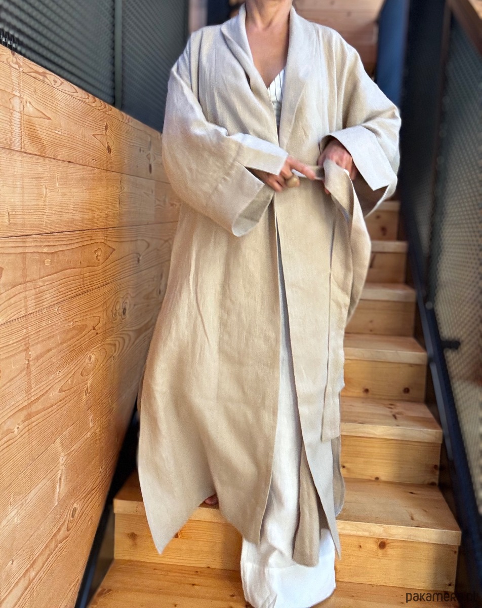 Kimono 100% lnu z szalowym kołnierzem, wiązaniem z jednej strony i pęknięciami po bokach.