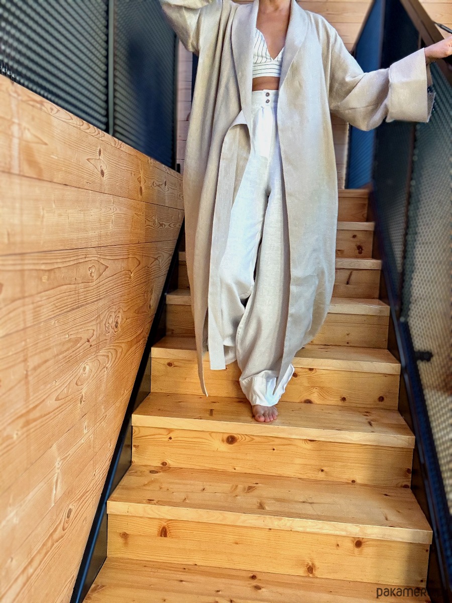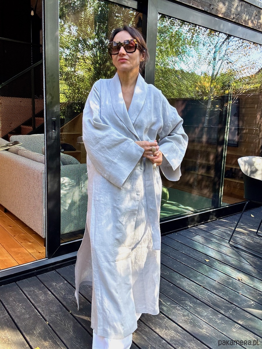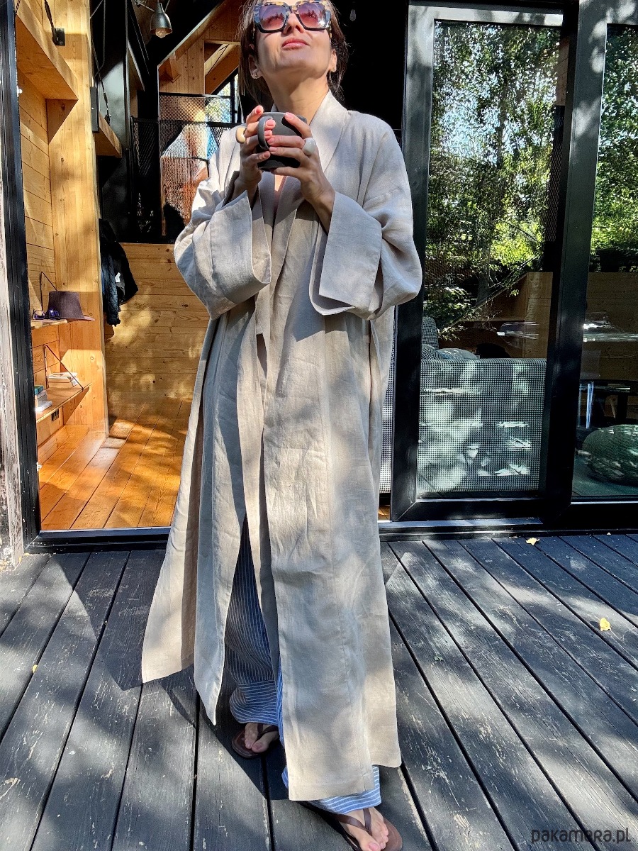 Długie kimono wykonane z wysokiej jakości, certyfikowanego lnu to połączenie komfortu i ponadczasowego stylu. Stworzone z lekkiej, oddychającej tkaniny, aby zapewnić komfort zarówno w domu, jak i w codziennych i wakacyjnych stylizacjach.