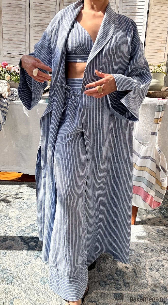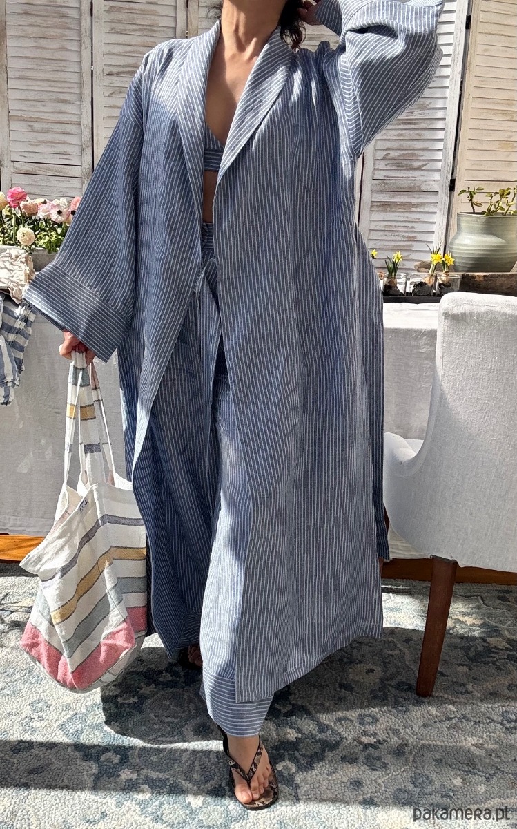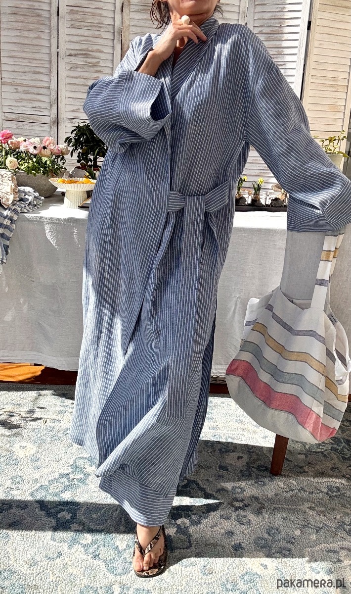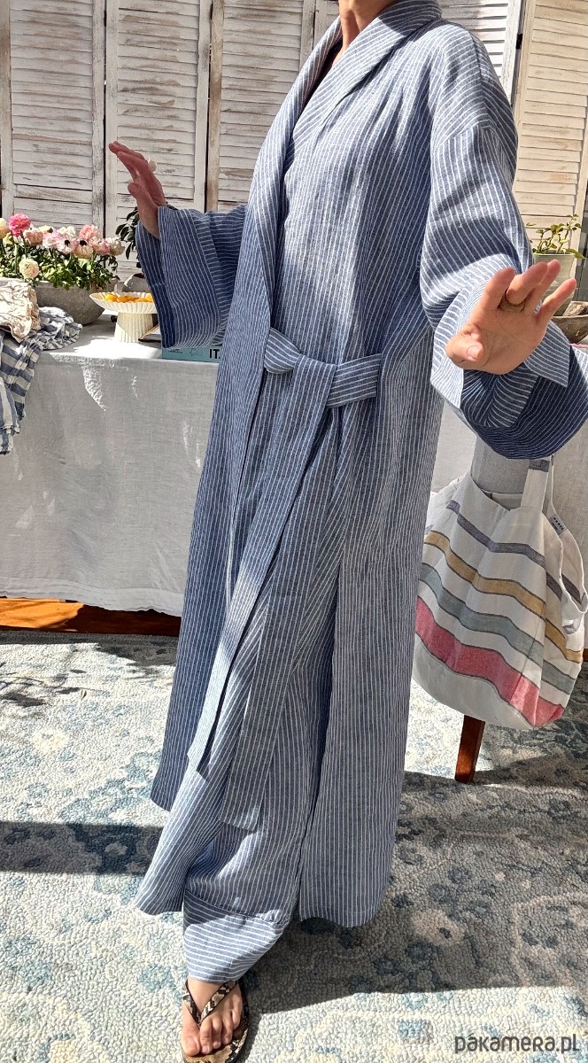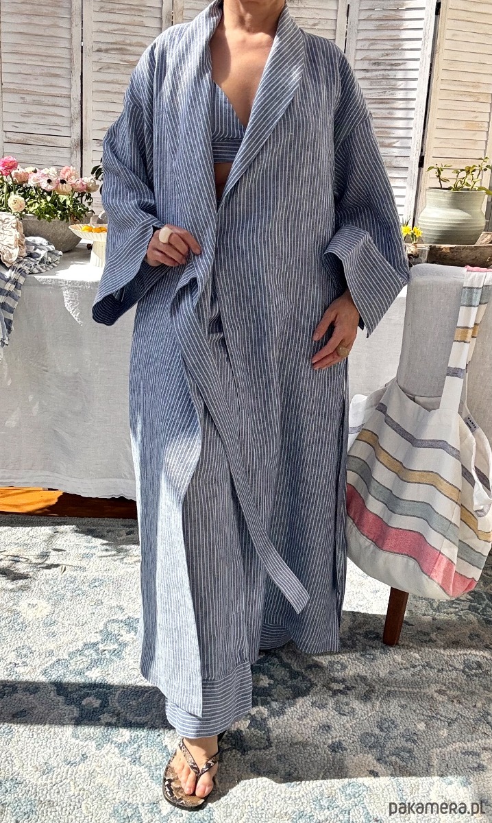 Długie kimono – naturalna lekkość w lnie tkanym w błękitno- niebieskie prążki