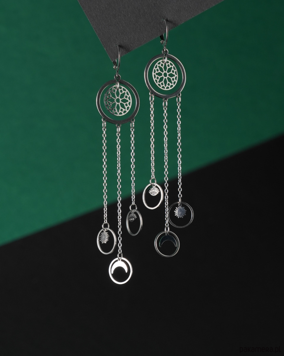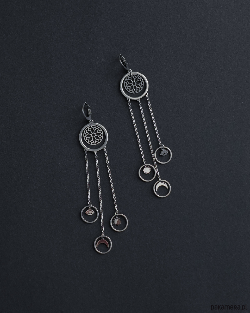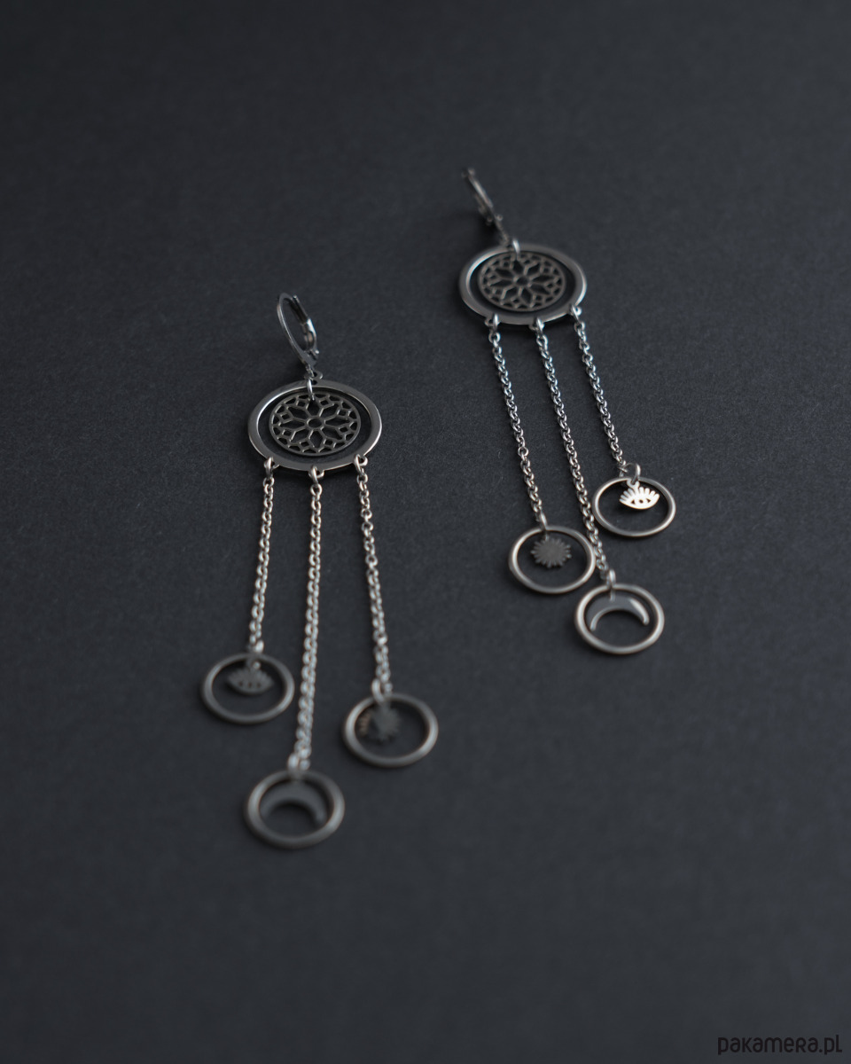 Długie i niezwykle efektowne kolczyki a'la ŁAPACZ SNÓW z małymi zawieszkami z motywem OKA, LUNULI oraz SŁOŃCA. Zawieszone na bezpiecznych, zamykanych biglach typu "kajdanki".