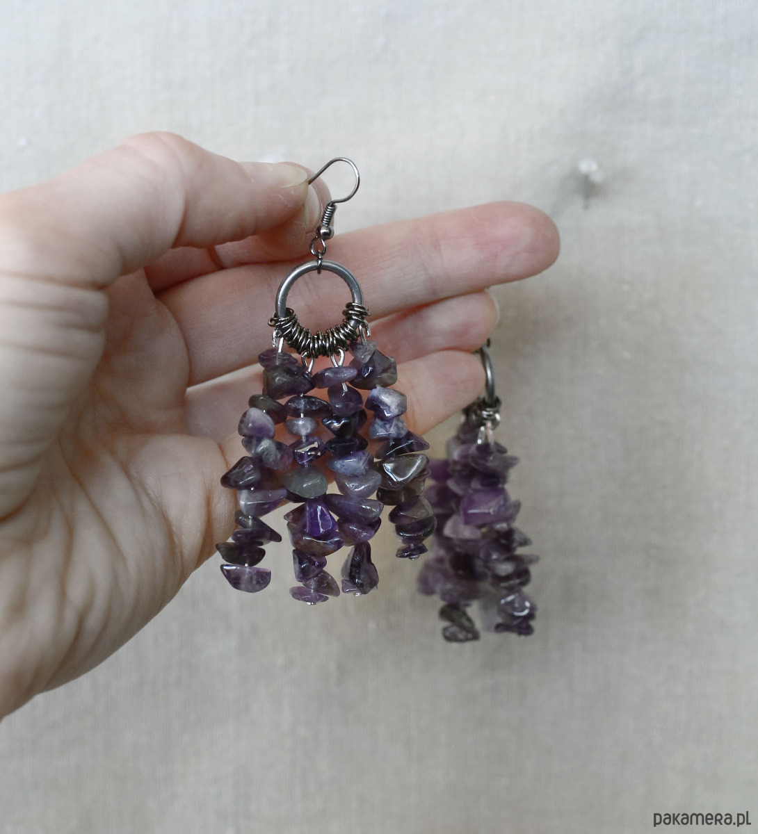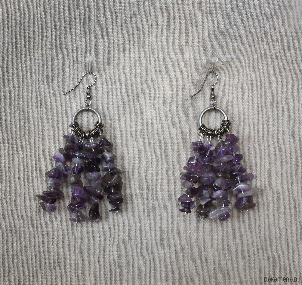 Kolczyki wiszące, w stylu boho, wykonane z ametystowych koralików w tonacji fioletowej. Bigle ze stali w kolorze antracytu.