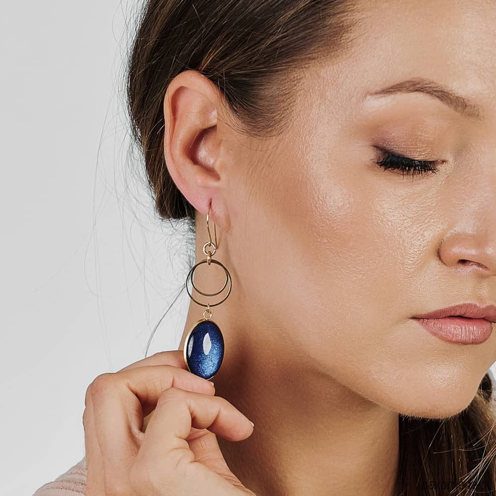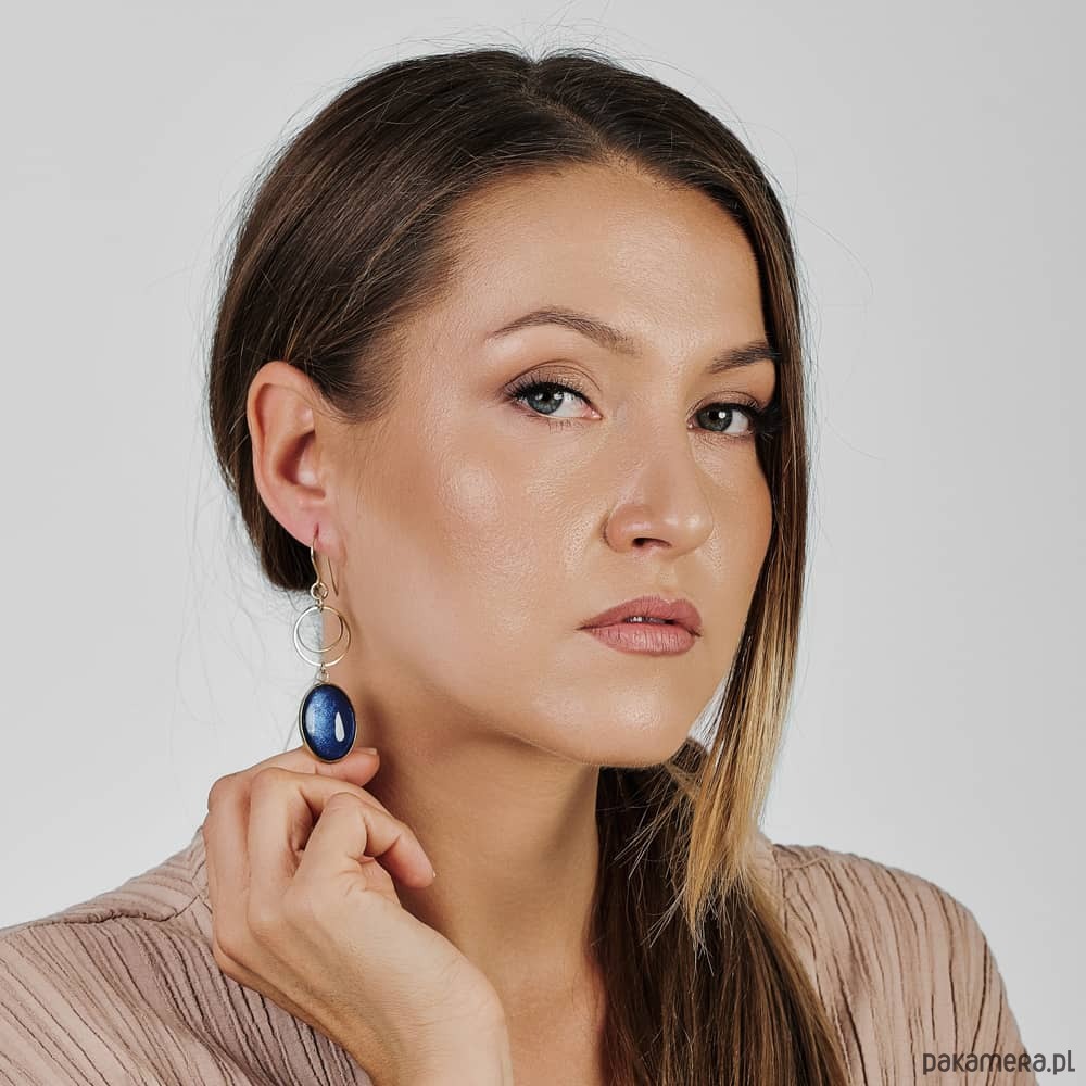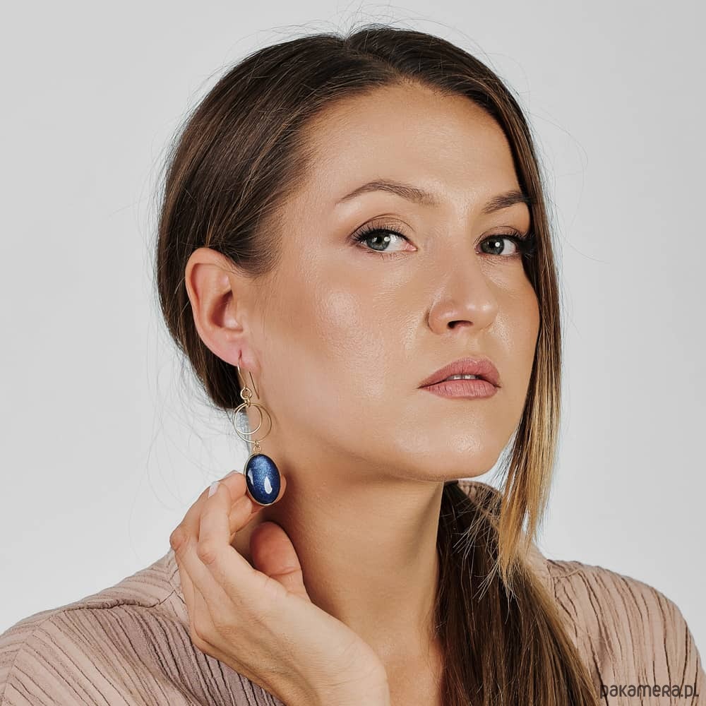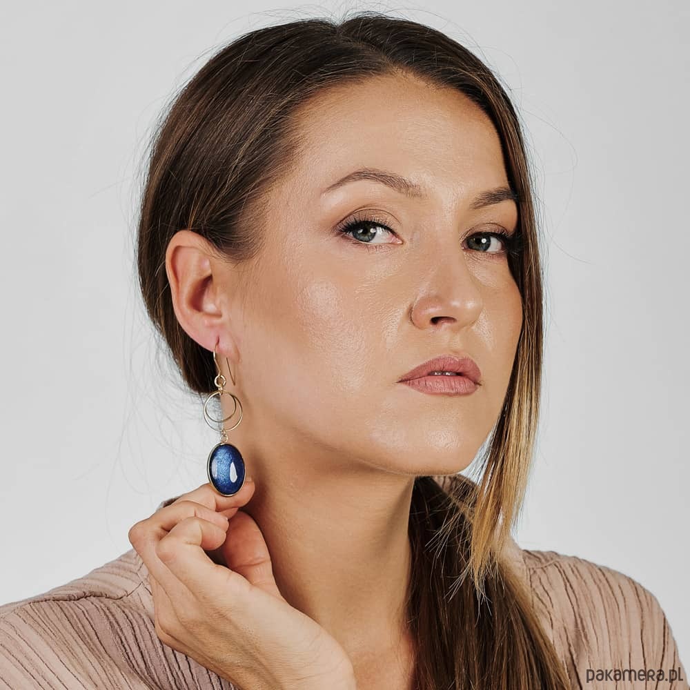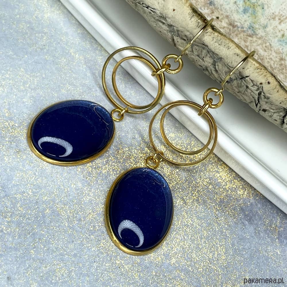 Te pełne blasku kolczyki są częścią kolekcji “W blasku perłowego księżyca”. Kolczyki wykonane są z ręcznie malowanych kaboszonów umieszczonych w bazach ze stali szlachetnej. Szklane elementy zachwycają subtelnym, opalizującym blaskiem, który jest niczym odbicie księżyca na tafli wody. Kolczyki mienią się w świetle, przyciągając wzrok i dodają elegancji każdej stylizacji. Ten dodatek jest idealny dla osób ceniących sobie wyrafinowaną i ponadczasową biżuterię.