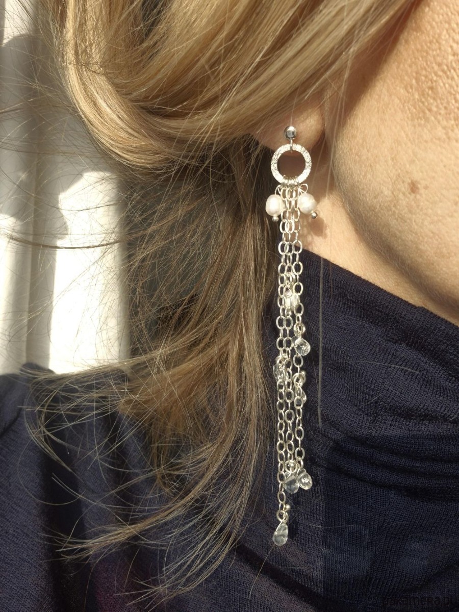 Eleganckie, długie kolczyki ślubne wykonane ze srebra próby 925. Na biglach zawieszone są delikatne łańcuszki, ozdobione naturalnymi perłami oraz kroplami brioletek z kryształu górskiego. Kryształy pięknie odbijają światło przy każdym ruchu.