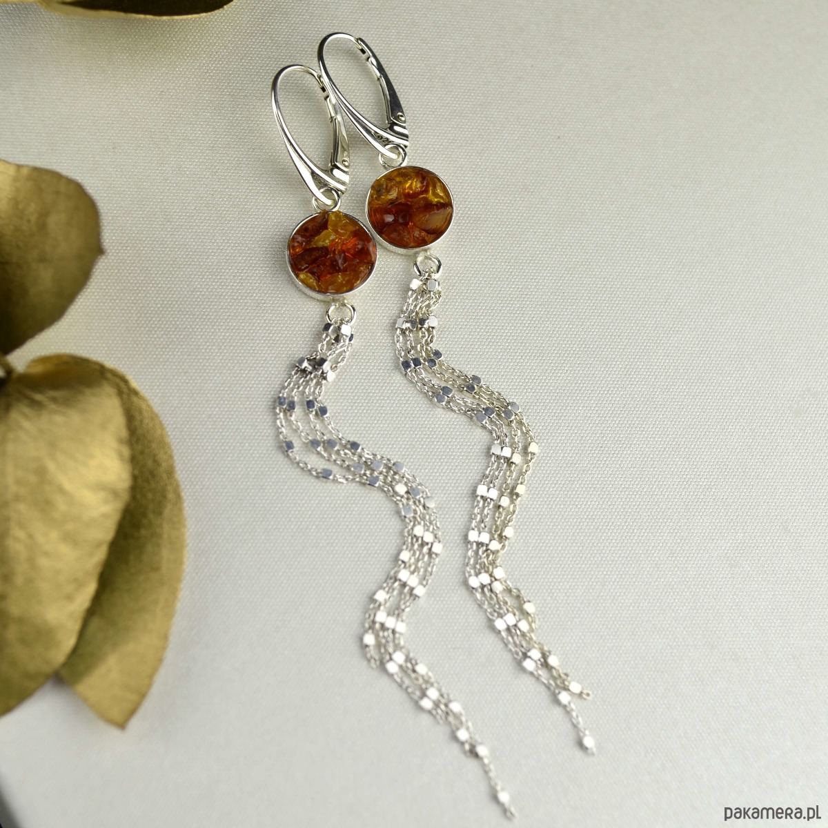 Długie srebrne wiszące kolczyki z bursztynem