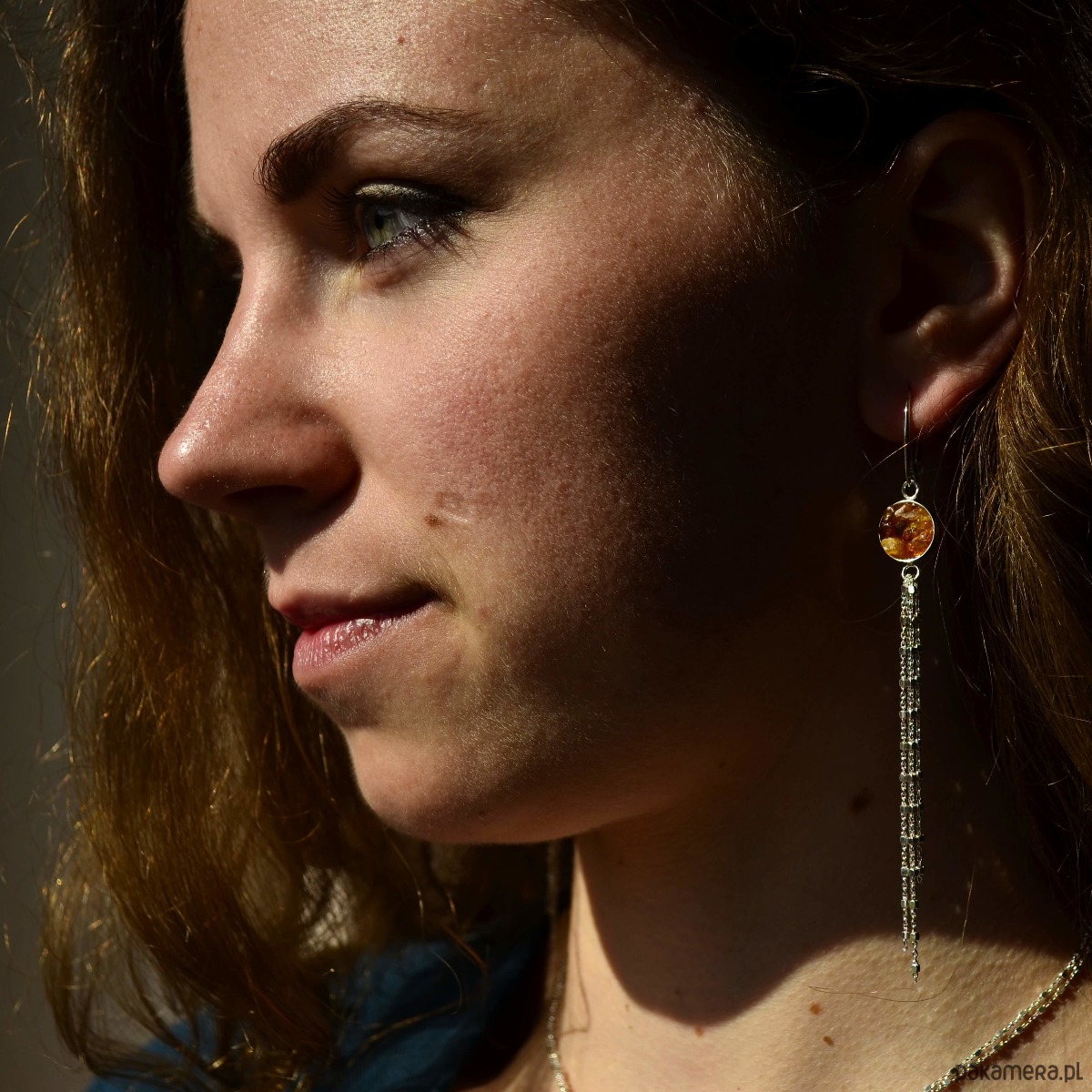 Bardzo długie kolczyki wykonane ze srebra próby 925 i kawałków surowego bursztynu bałtyckiego. Naturalne, zebrane z plaży bursztynki zamknęłam w srebrnym kole o średnicy 1 cm. Kolczyki mają długie chwosty z ozdobnego srebrnego łańcuszka o różnych długościach (fantastycznie układa się podczas noszenia!). Bursztyny w kolczykach mają różne ciepłe odcienie: od żółtego, poprzez pomarańczowy do brązu. Z uwagi na różne kształty i kolory bursztynu każda sztuka biżuterii różni się delikatnie od siebie.