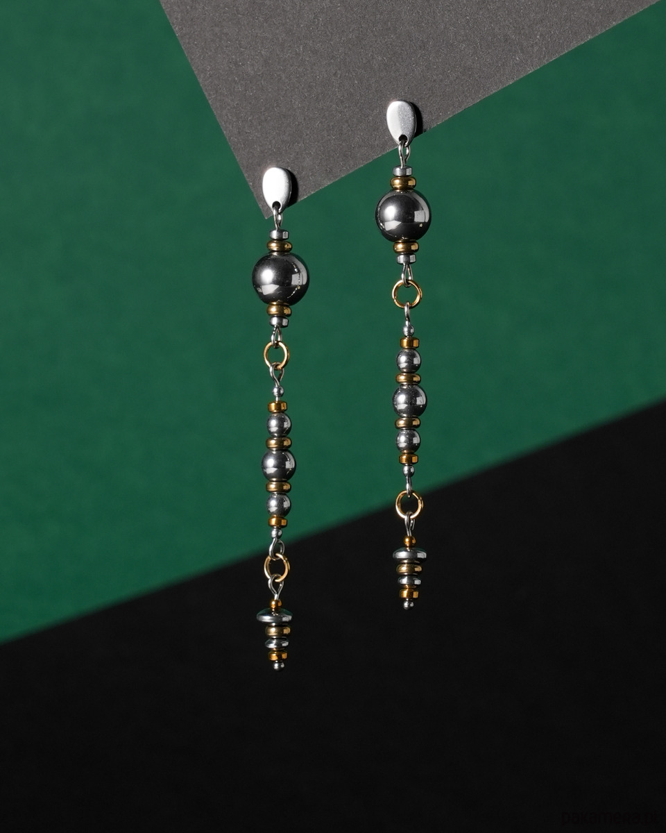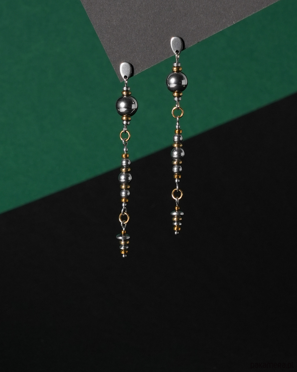 Długie, efektowne i oryginalne kolczyki wykonane ze srebrnego i złotego HEMATYTU, zawieszone na ozdobnych sztyftach w kształcie łezki. Wszystkie metalowe elementy to srebrna i złota STAL SZLACHETNA. Propozycja dla kobiet, które lubią autorską, niepospolitą biżuterię.