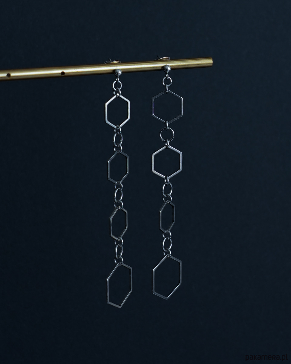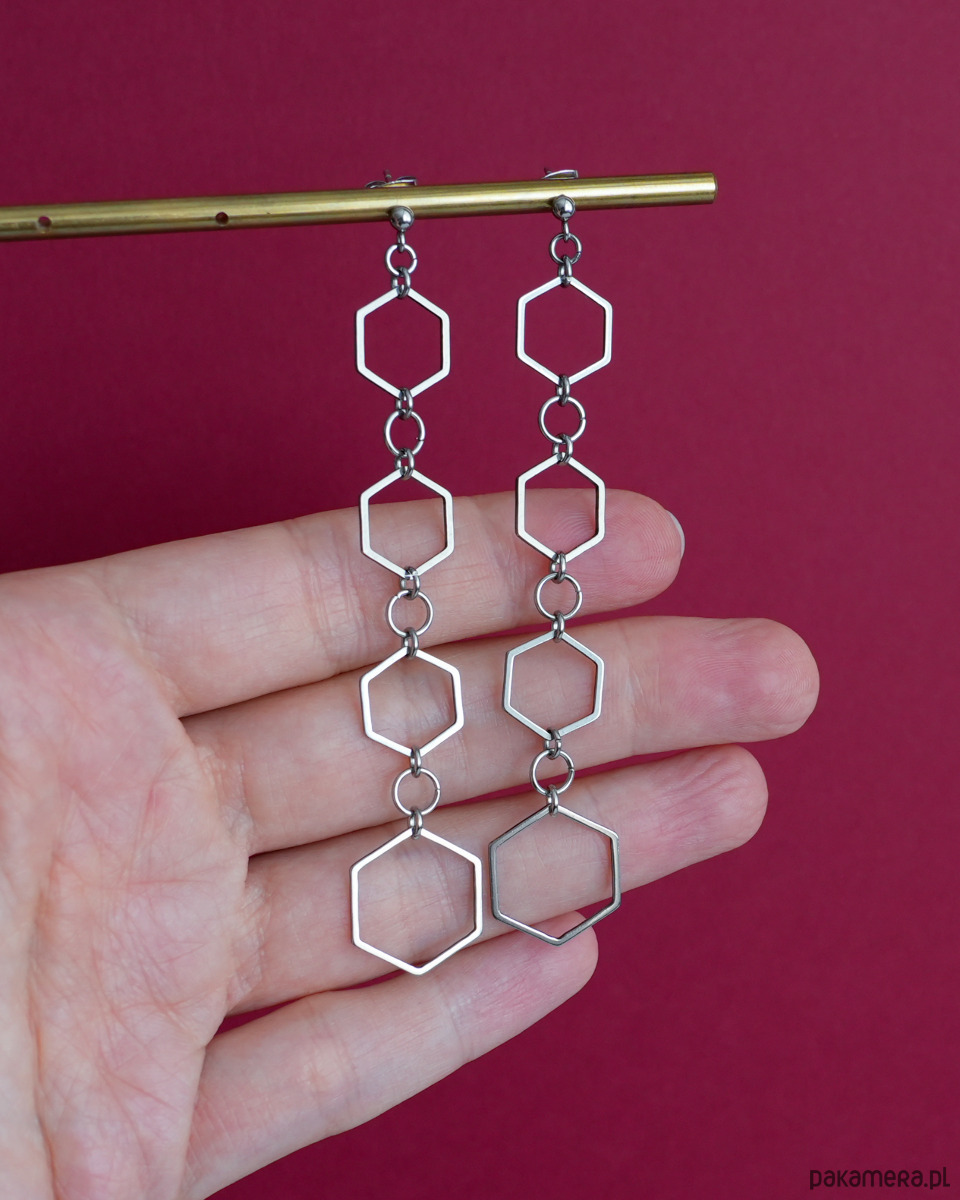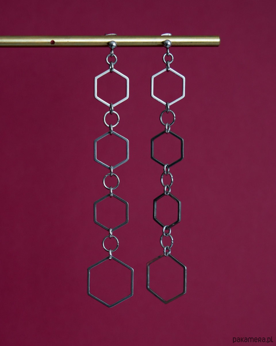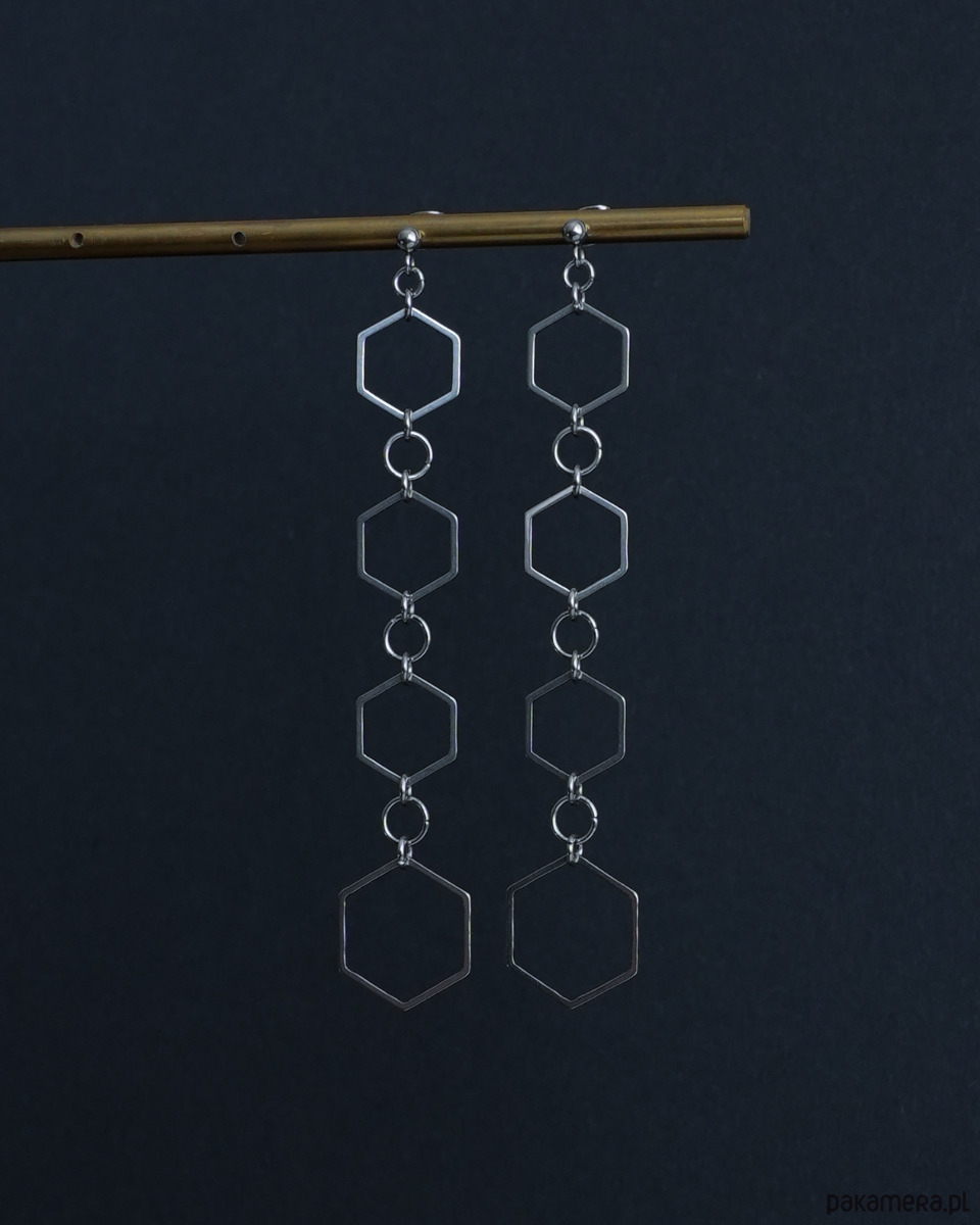 Długie, nowoczesne i oryginalne kolczyki geometryczne z heksagonami, w całości wykonane ze STALI SZLACHETNEJ.