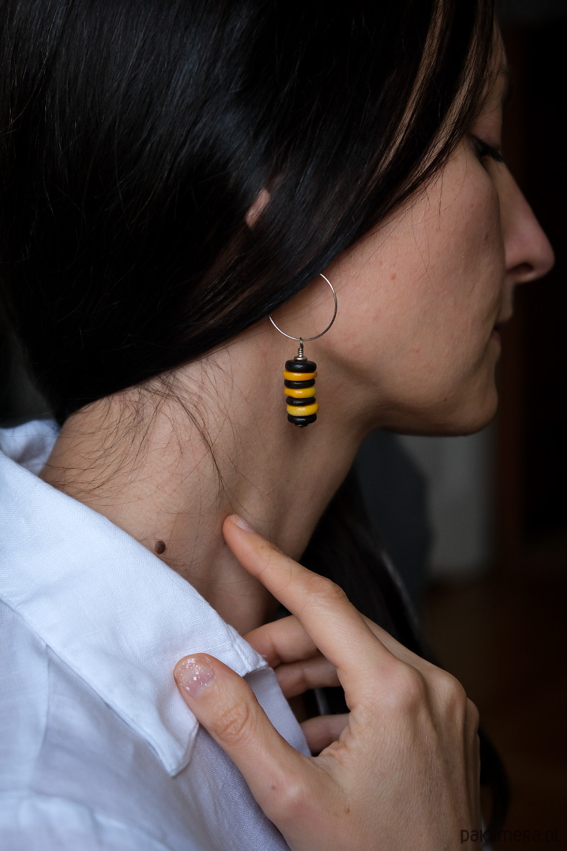 Kolczyki ręcznie wykonane z ciemnożółtych kamieni mineralnych, czarnego drewna i stali szlachetnej (chirurgicznej) najwyższej jakości.
