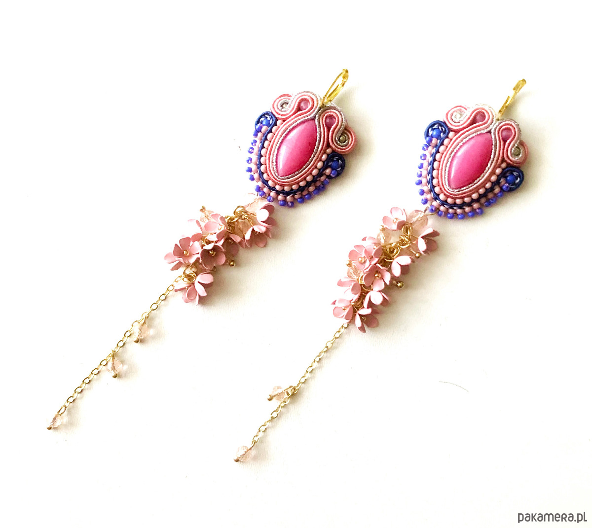 Kolczyki z sutaszu - w połączeniu jasnego różu i indygo z różowym jadeitem. Długość ok. 13 cm. Zawieszone na antyalergicznych biglach, możliwość wymiany na klipsy lub sztyfty. Kolczyki wykonywane na indywidualne zamówienie.