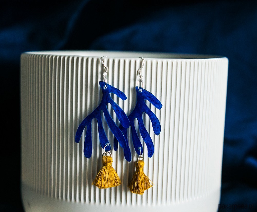 Długie szafirowe kolczyki z chwostami w kolorze musztardowym to wyraziste i pełne energii połączenie elegancji z odrobiną boho. Górna część w odcieniu głębokiego szafiru subtelnie połyskuje, a lekkie, musztardowe chwosty nadają całości ruchu i lekkości.