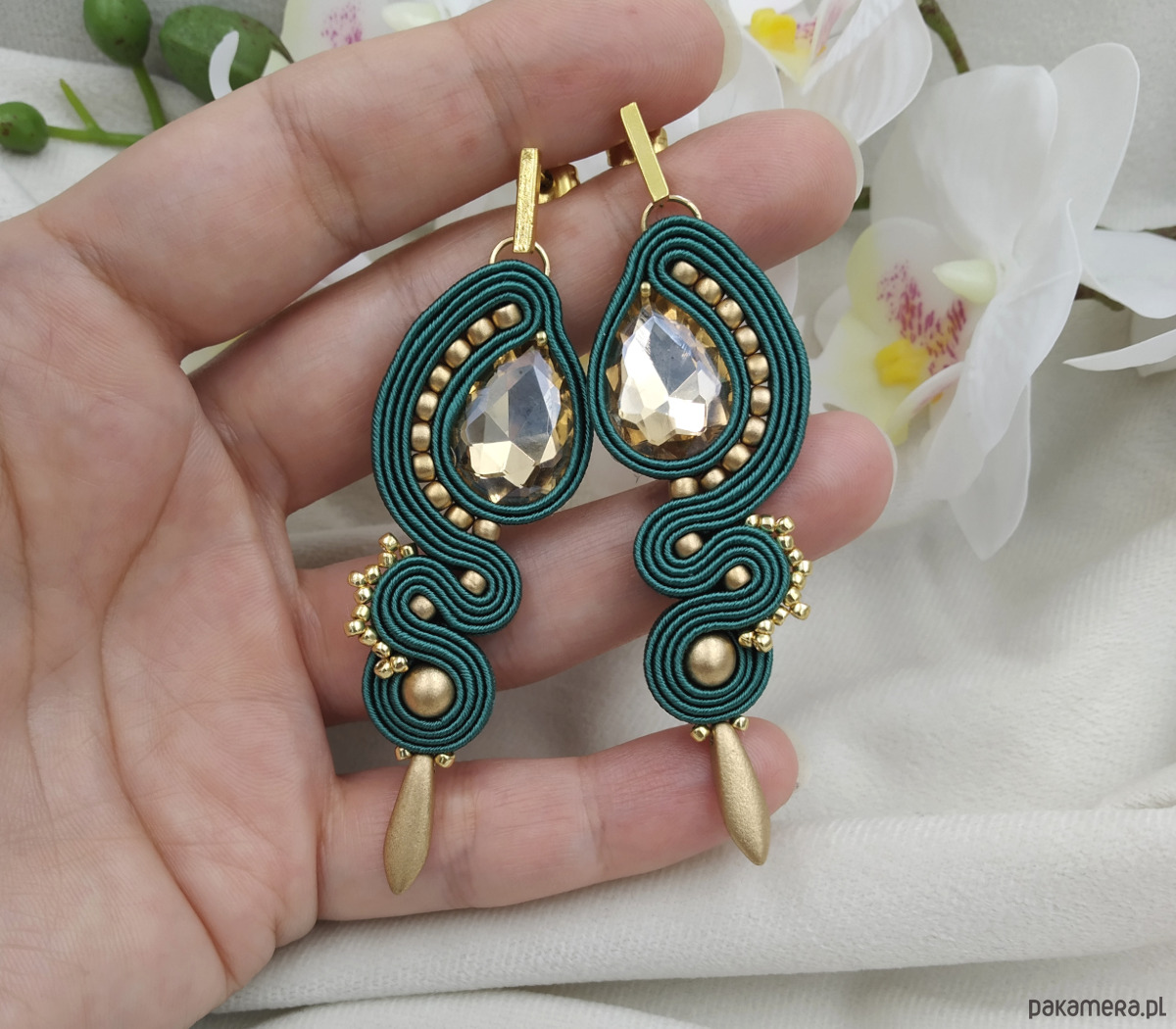 Długie szmaragdowe ciemnozielone butelkowe złote kolczyki soutache