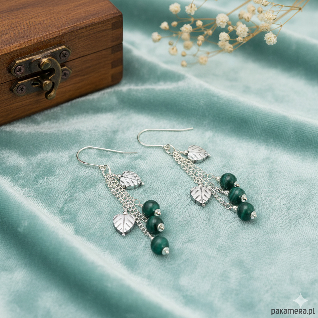 Ten komplet to prawdziwy ukłon w stronę natury. Połączenie głębokiej, pasiastej zieleni malachitu ze srebrzystymi detalami tworzy biżuterię, która przyciąga wzrok, ale pozostaje subtelna i pełna klasy.