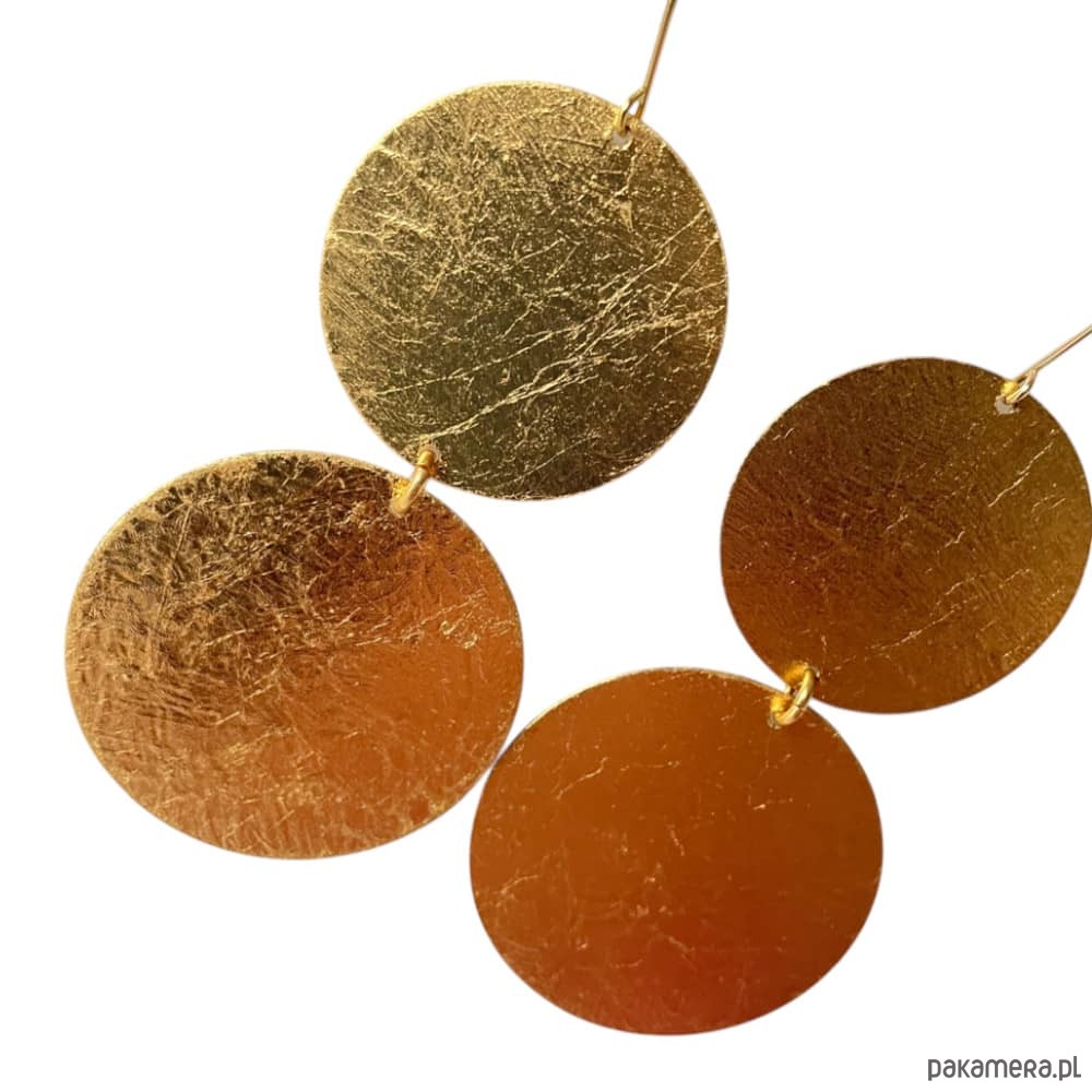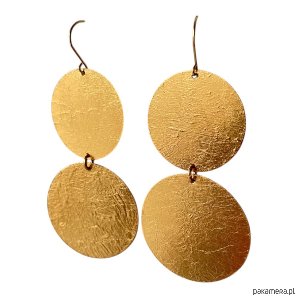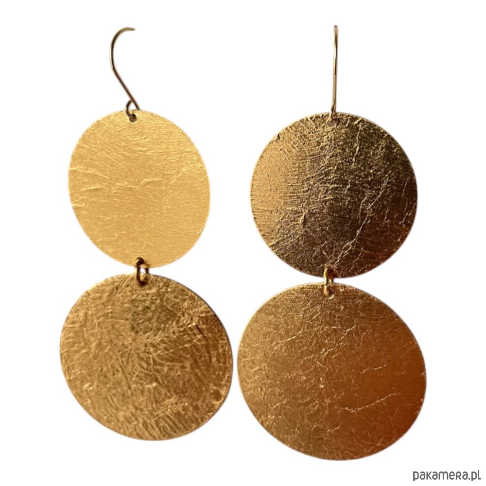 Długie kolczyki z dwóch połączonych kół wykonanych z mosiądzu pozłacanego. Fakturowana powierzchnia i ruchoma forma dodają im lekkości.
