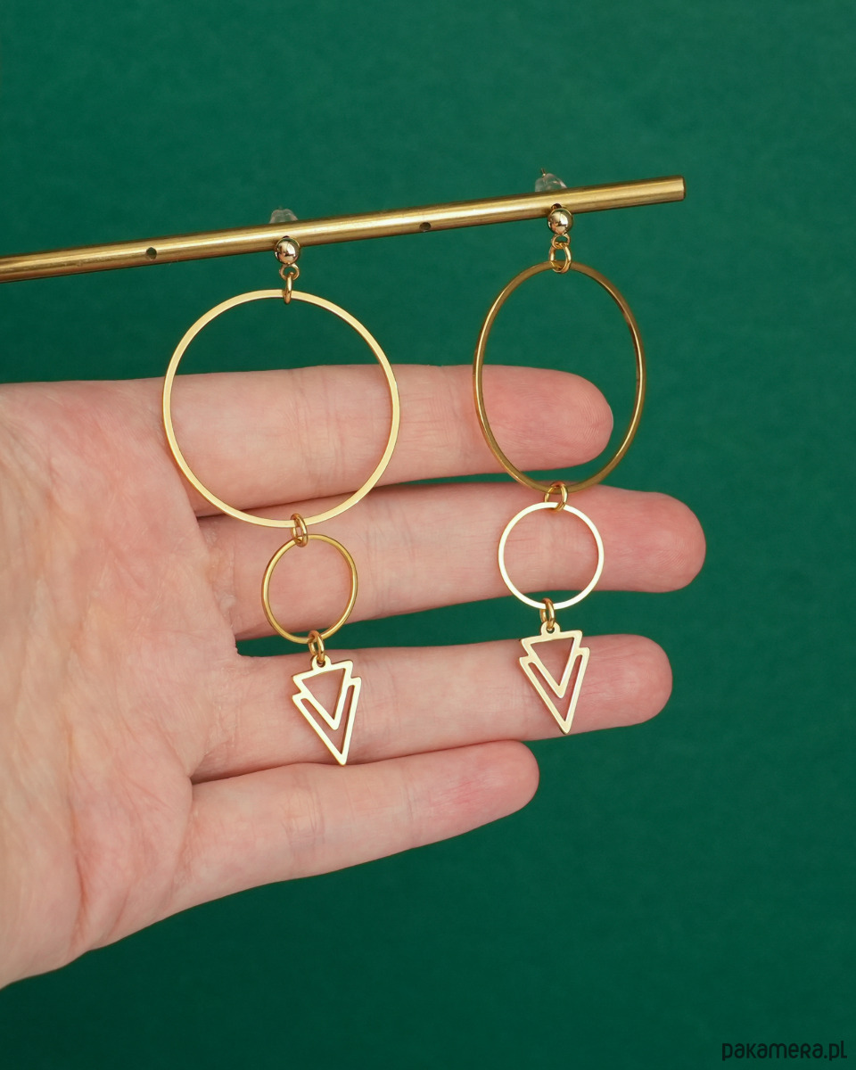 Nowoczesne, duże, złote kolczyki geometryczne z kołami i trójkątami, zawieszone na klasycznych sztyftach z kulką. Bardzo oryginalne i wyraziste, na pewno będą przykuwać wzrok. Do noszenia na co dzień i na imprezę.