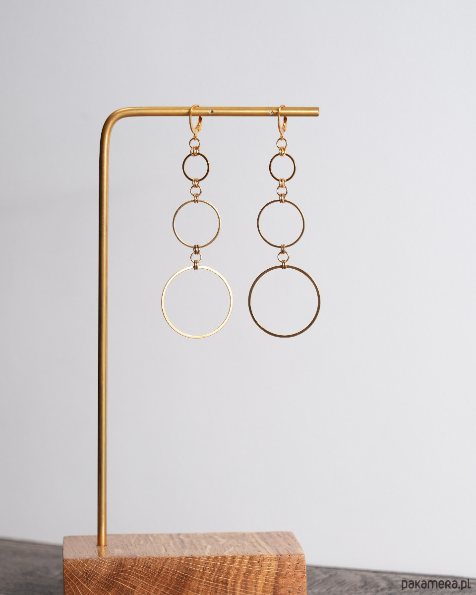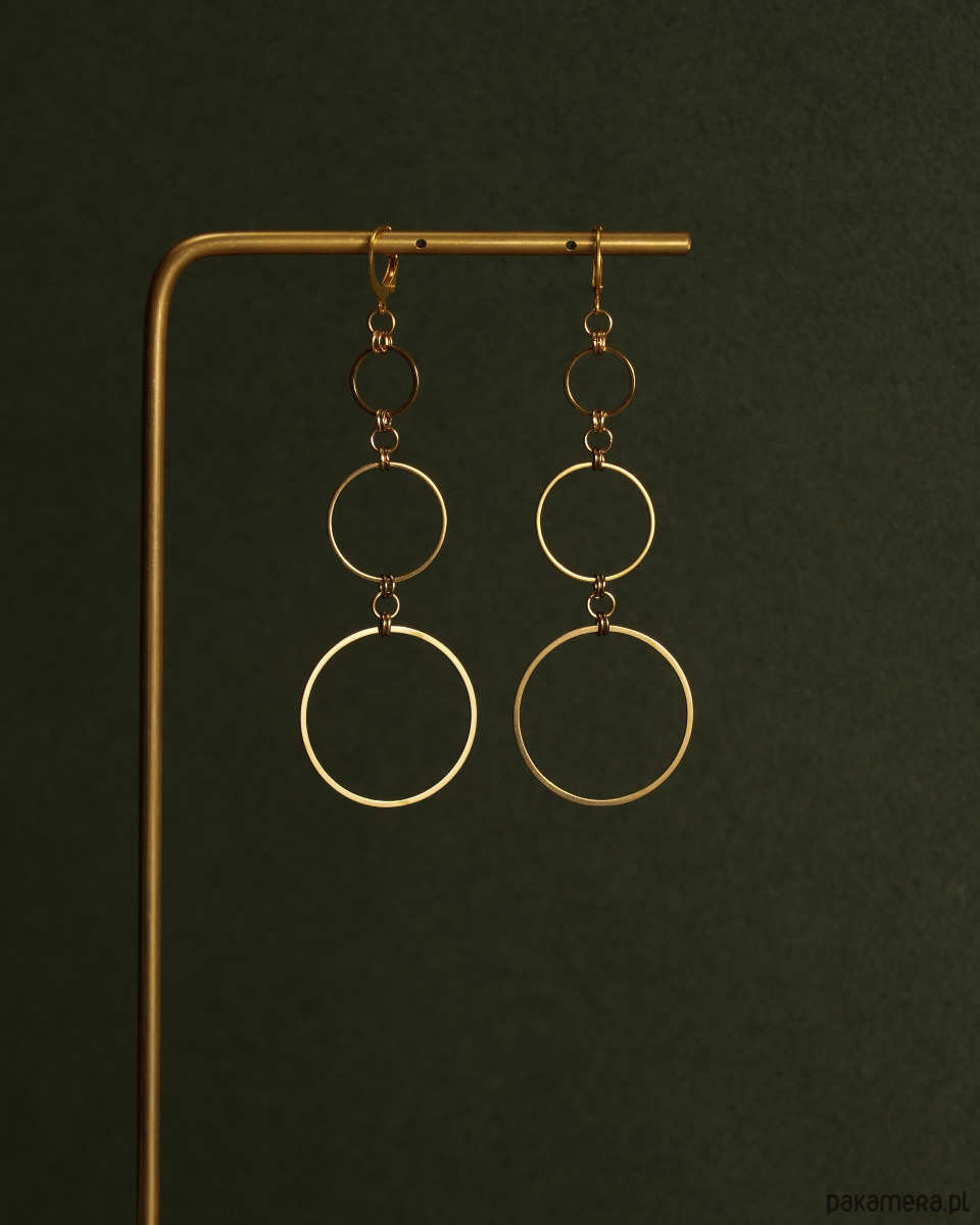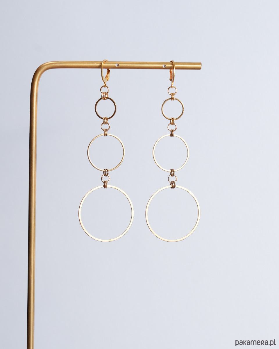 Bardzo długie i efektowne, nowoczesne kolczyki z 3 kołami różnej wielkości zawieszone na zamykanych biglach typu kajdanki. Kolczyki są w całości wykonane ze STALI SZLACHETNEJ w kolorze złotym.
