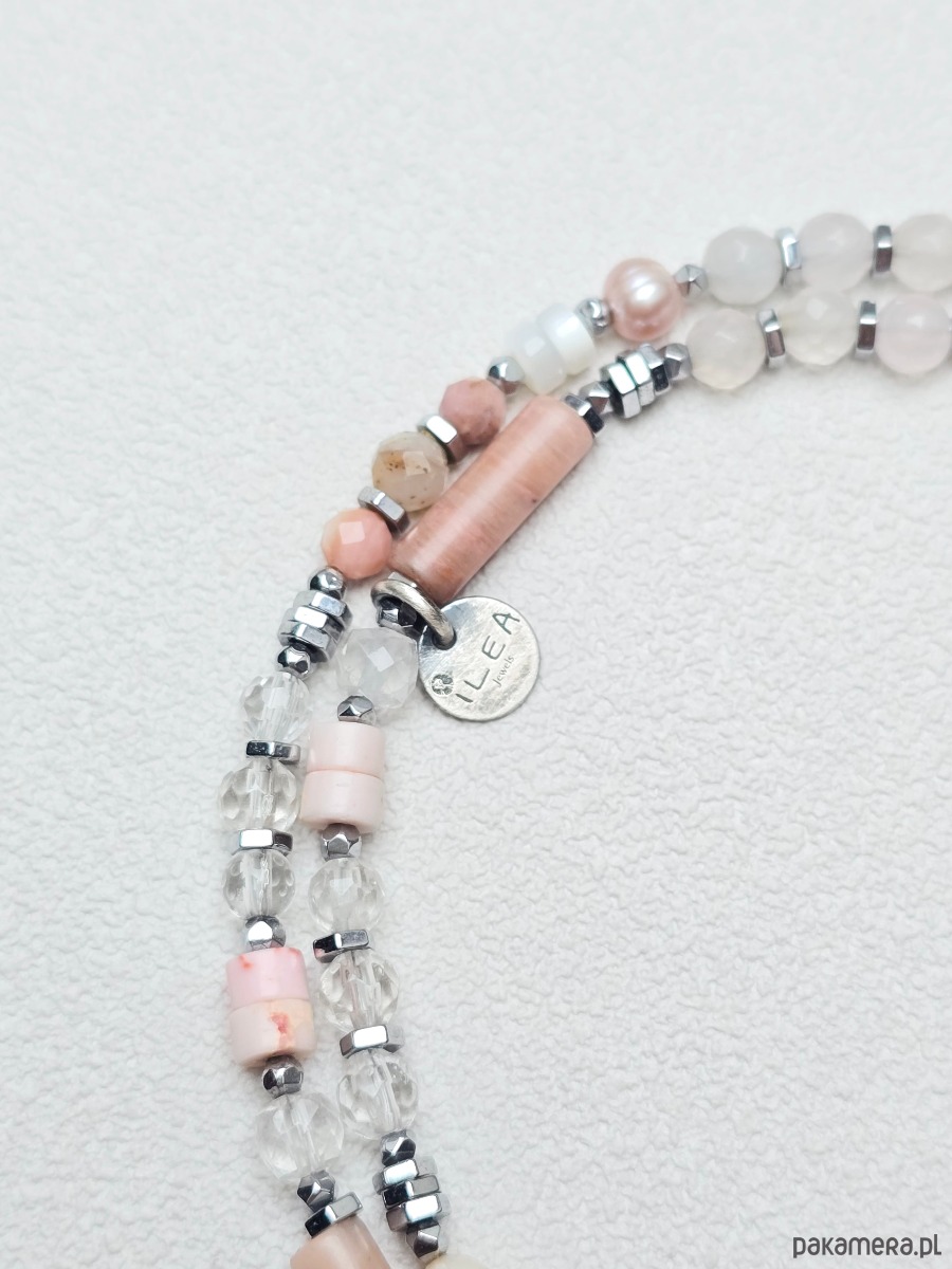 Dłuższy naszyjnik z kamieni naturalnych w pudrowej kolorystyce tj.: opal peruwiański, kwarc różowy, howlit, kryształ górski, rodonit, perły,masa perłowa hematyt.