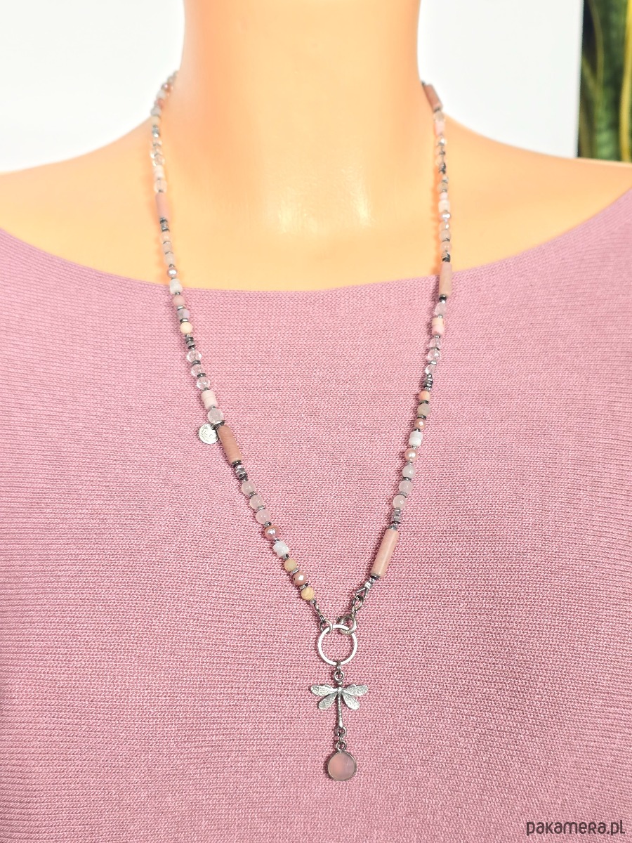 Naszyjnik zdobi zawieszka ważka z kwarcem różowym.