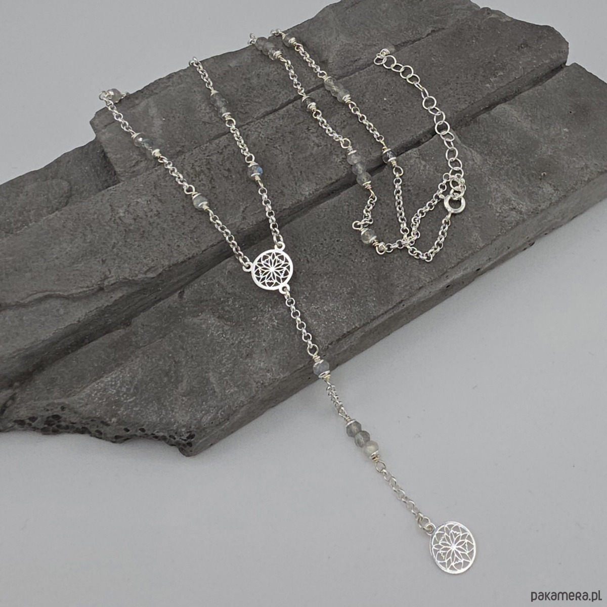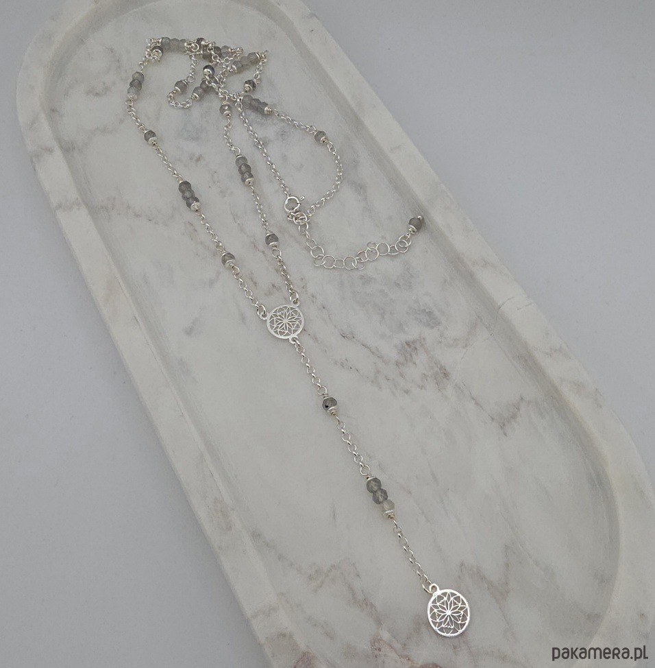 Kobiecy, elegancki, uniwersalny naszyjnik. Wykonany w całości ze srebra próby 925 oraz fasetowanych oponek labradorytu wielkości ok. 4x3 mm. Solidny łańcuszek typu rolo o grubości 2,2 mm. Całkowita długość naszyjnika regulowana w zakresie 57-62 cm, a długość elementu wiszącego 8,5 cm. Na życzenie mogę go zoksydować lub wykonać z innymi kamieniami. Ozdobnie zapakowany.