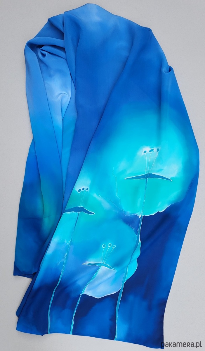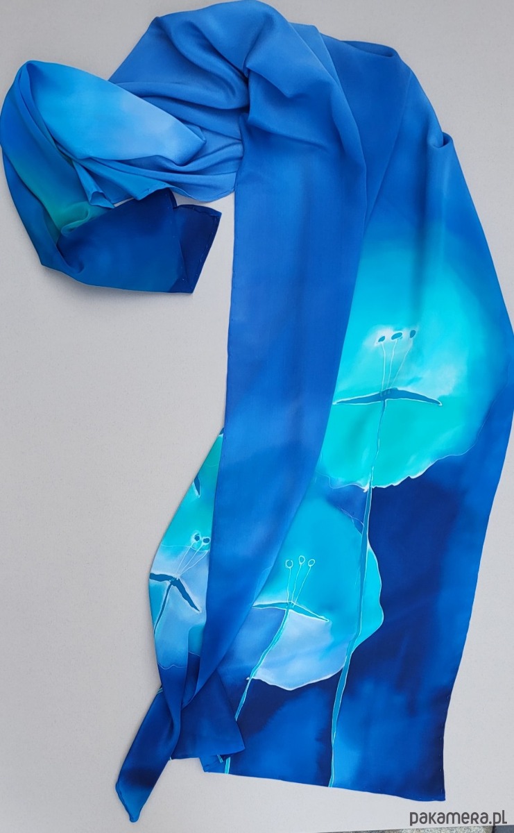 Delikatny, ręcznie malowany szal z wzorem. Naturalny jedwab, doskonały zarówno na jesienne i zimowe chłody, jak i letnie upały. Wymiary pracy to 55x180cm.W szalu dominują błekity, turkusy i granaty. Całość namalowana na pięknie lejącej się krepie jedwabnej wysokiej jakości. Praca utrwalana termicznie pod ciśnieniem, praktycznie nie spiera się i nie płowieje, pozwalając cieszyć się pięknem szala przez długie lata. Naturalny jedwab, doskonały zarówno na jesienne i zimowe chłody, jak i letnie upały. Wzór malarski zajmuje około 30% powierzchni szala. Praca opatrzona jest certyfikatem pochodzenia/autentyczności w pięknym opakowaniu, uzupełnionym o przepis prania. Mogę personalizować.