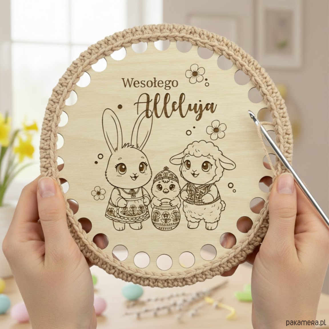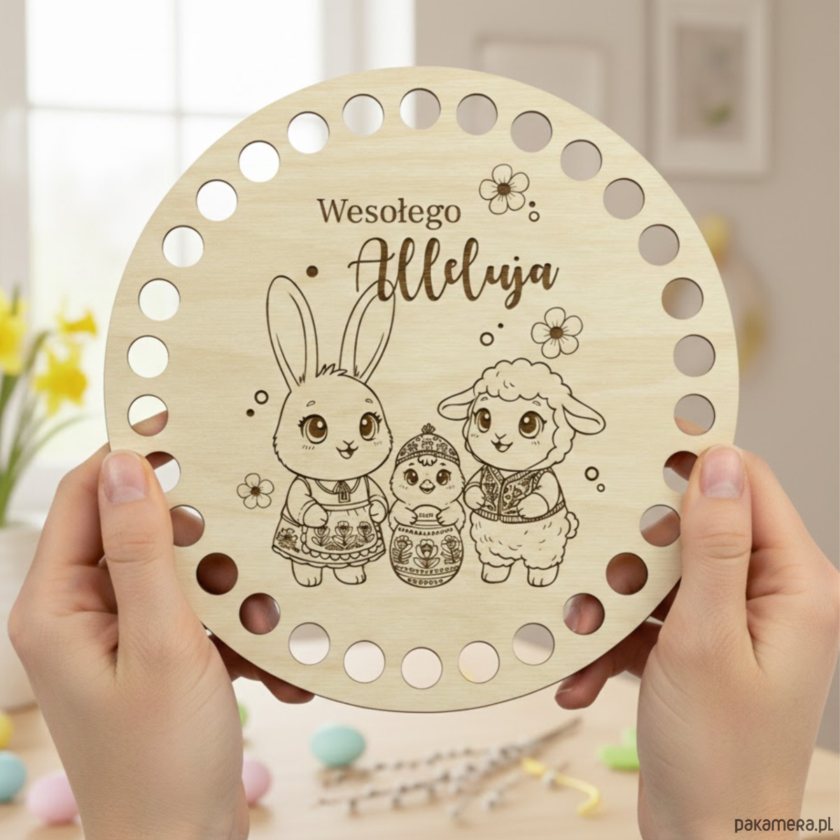 Drewniana baza wielkanocna do szydełkowania w kształcie okręgu to idealna podstawa do tworzenia drobnych, ręcznie robionych dekoracji świątecznych. Naturalne drewno i precyzyjne wycięcia sprawiają, że praca z nią jest łatwa i przyjemna.