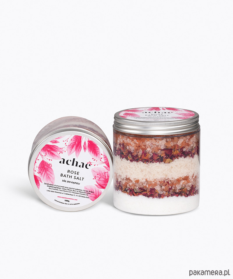 Różowa sól himalajska, sól z Morza Martwego, suszone płatki róży, olej kokosowy, olejek geraniowy.
