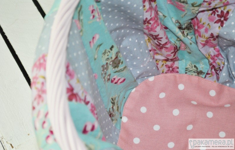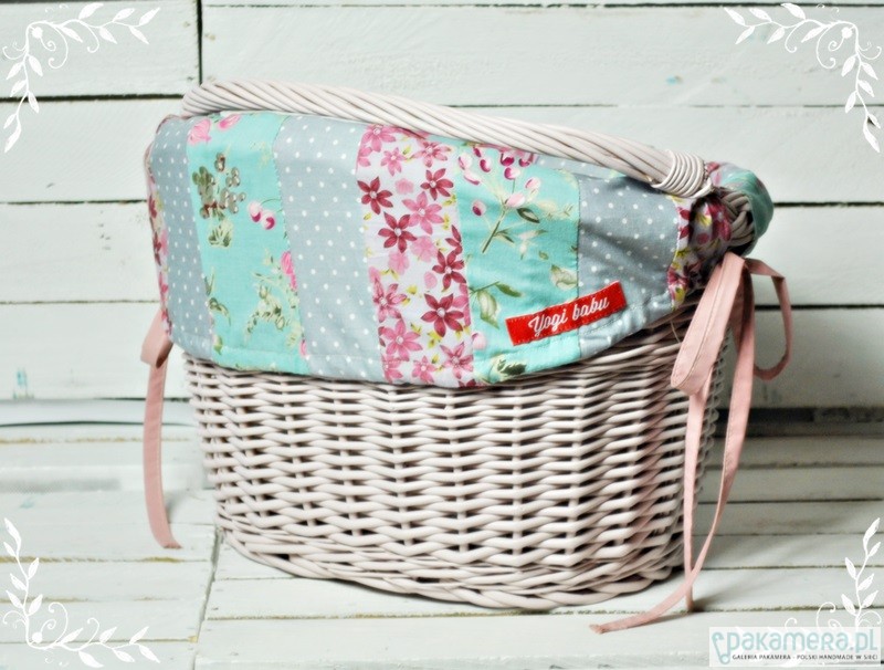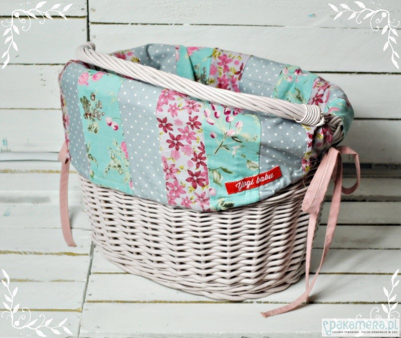 Kosz rowerowy z odrutowaniem oraz hakami do zawieszenia na kierownicy roweru. Kosz posiada składaną rączkę przez którą również przechodzi drut dzięki czemu jest ona bardzo wytrzymała. Kosz wykonany bardzo starannie z wyselekcjonowanej wikliny. kosz lakierowany eko farbami kolor pudrowy róż Poszewka PATCHWORK autorstwa YOGI BABU PROJEKT. Wymiary: WYSOKOSC 28 CM SZEROKOSC 40